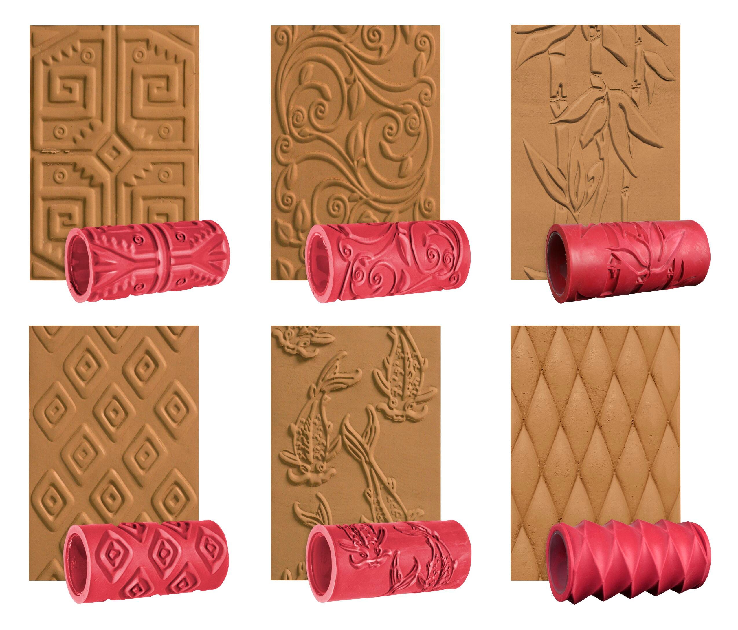 AMACO Clay Texture Rollers allow you to roll out a continuous design on a slab of clay. Watch a plain slab become an instant work of art. Decorate textured bisque with glazes to accent the texture. Create tiles, vessels and more. Texture sleeves measure 4 inches wide. Set includes 6 each of sleeves and handles.Includes 6 Texture Rollers: