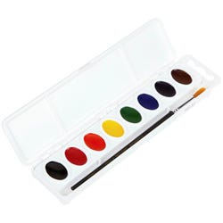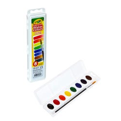The Crayola Semi-Moist Oval Pan Watercolor Paint Set delivers easy-to-use watercolor paint for artists of all ages. The paint applies smoothly onto your brush in true hues that don't fade away when water is added giving you strong coverage and great color mixing. The durable plastic tray includes a flip-top lid that can be used as a mixing pan and a durable size 7 paint brush so you're ready to lay down beautiful designs. Safe and non-toxic, ideal for children ages 4 and up. This paint set includes 8 pans, 1 each of the following colors: black, brown, green, orange, blue, violet, red, and yellow.Features