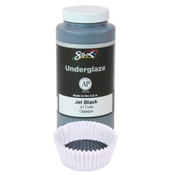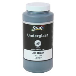 Sax Jet Black underglaze paint comes in a concentrated opaque liquid color. Decorate pottery with this glazing paint that's ready for use on clay, greenware, and bisque. The color may be a different shade during application and will change to the desired look after the required kiln firing. This painting medium's color does not change when fired at cone 6. Our high-quality underglaze has a matte look after firing and can be transformed to a shiny, rich glaze appearance with a transparent glaze coating on top.Features