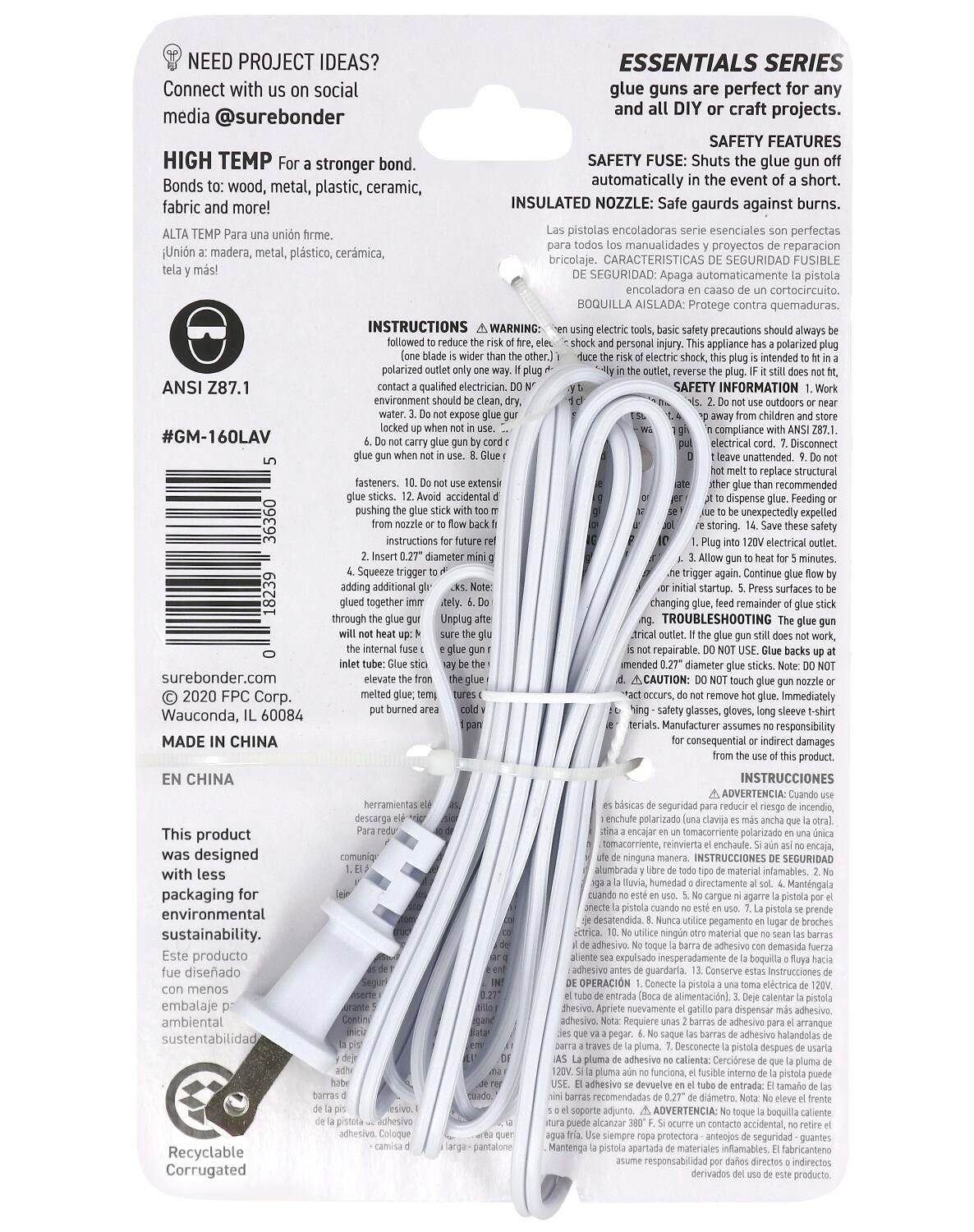 Surebonder is excited to bring you 5 new fresh color concepts, bold colors to match your personality, collect them all or choose your favorite, this is lavender. A mini glue gun that is ideal for crafts, floral, and do it yourself projects that will even look great in your classroom. Plug in cord for power and unplug immediately after use. Insert glue stick into the chamber, pull the trigger to advance glue.