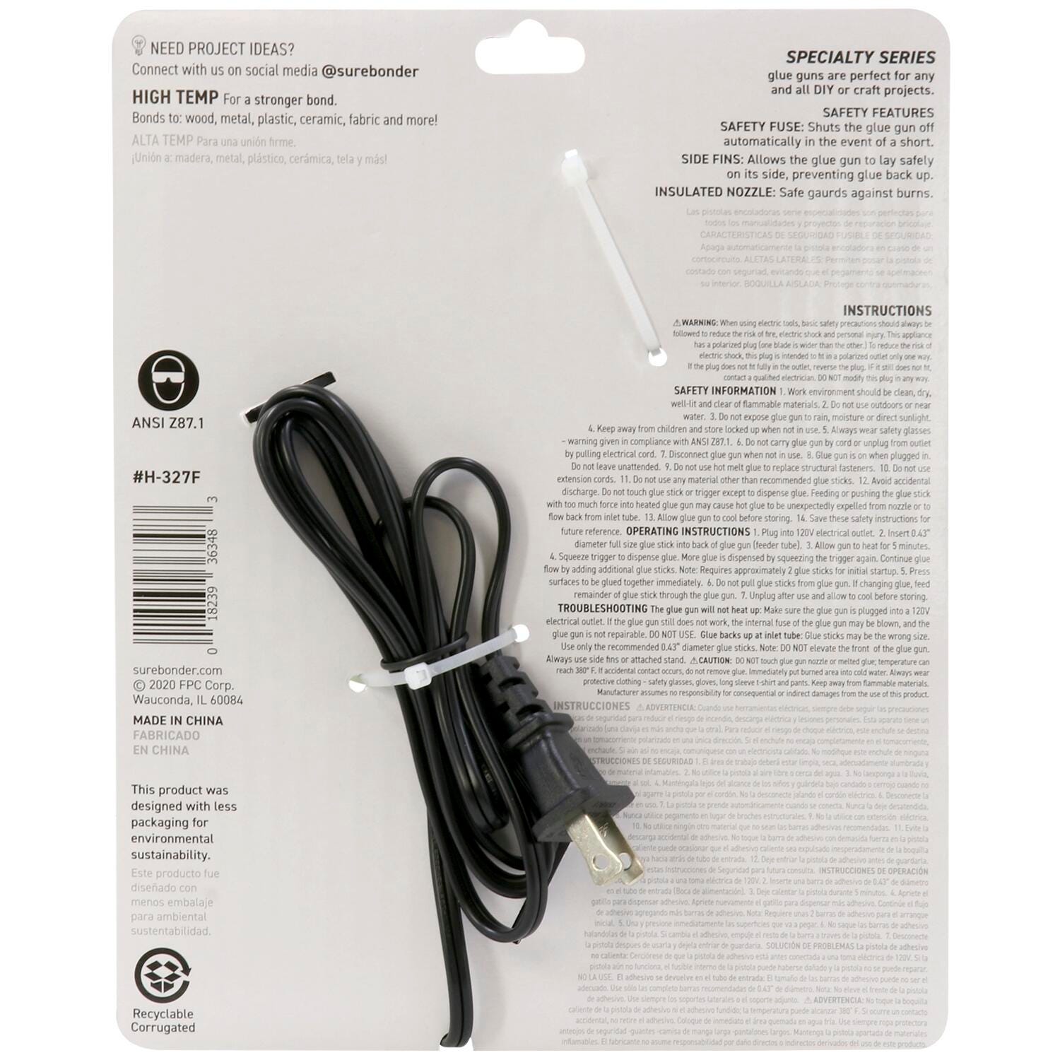 The Surebonder H-327F Detail Tip Hot Glue Gun has a nozzle orifice size of .063 (1/16) inches making it perfect for detailed craft projects! This glue gun has 50 percent more power than your average glue gun allowing for continuous glue output, and the fine detail tip allows for precise application in any project. The glue gun also contains a safety fuse in case of malfunction.