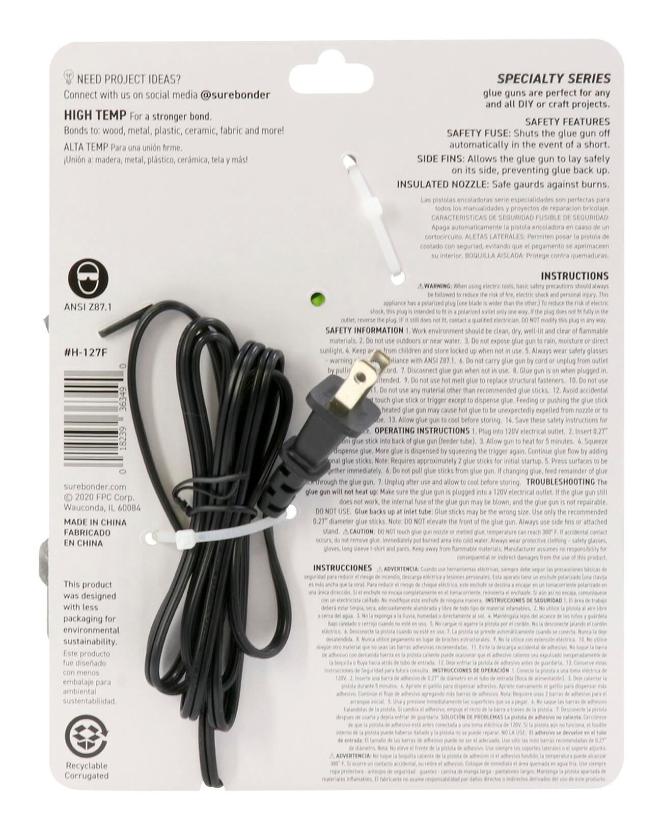Crafters, DIY-ers, and handy homeowners meet Surebonder's most powerful mini-size glue gun to date - the 60-watt high-temperature H-127F! This heavy-duty hot glue gun is perfect for any quick fix or project, having 5 times the power of a regular mini glue gun. Heats up in 3-5 minutes to 380°F operating temperature, providing continuous glue flow. Insulated nozzle, laydown feature, safety fuse, and On/Off switch.