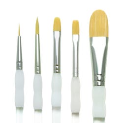 Royal Brush Soft Grip Starter Paint Brush Set includes 3/4 in oval pop, 20/0 liner, round size 5, filbert 8 and shader size 8. It is ideal for a number of paint types including acrylics, watercolor and tempera. It features a thick acrylic handle with a soft rubber grip which prevents it from slipping thus offering good comfort and control. The durable golden taklon fibers have smooth ferrules and the brush is sold as 5 per pack.Features