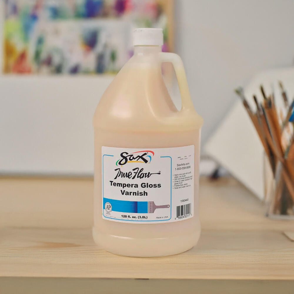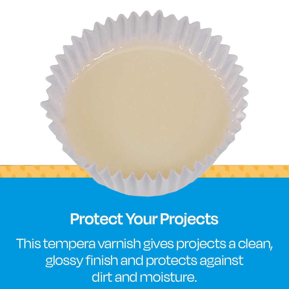 Protect tempera paintings and projects with this glossy sealer from Sax. This specially designed varnish won't smear or reactivate tempera paint and dries to an eye-catching glossy finish. The varnish makes a great addition to art classrooms or studios and can be cleaned with simple soap and water. If you are uncertain how the varnish will work on your project, test it on a small area first. Use a clean, dry, soft brush for application.