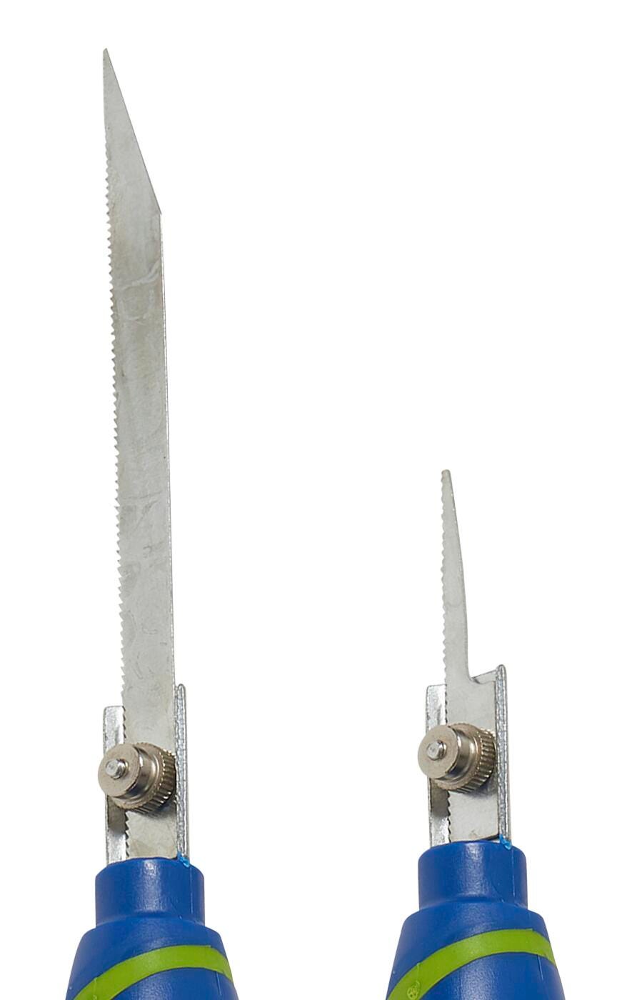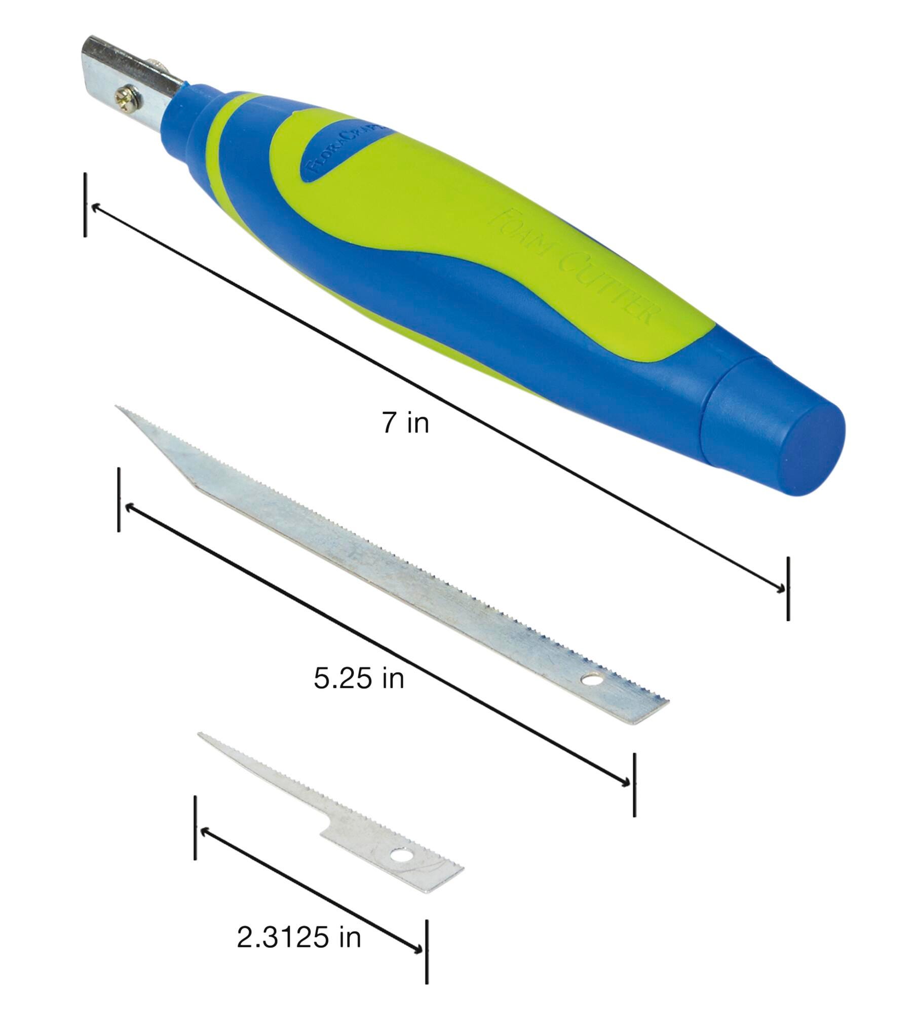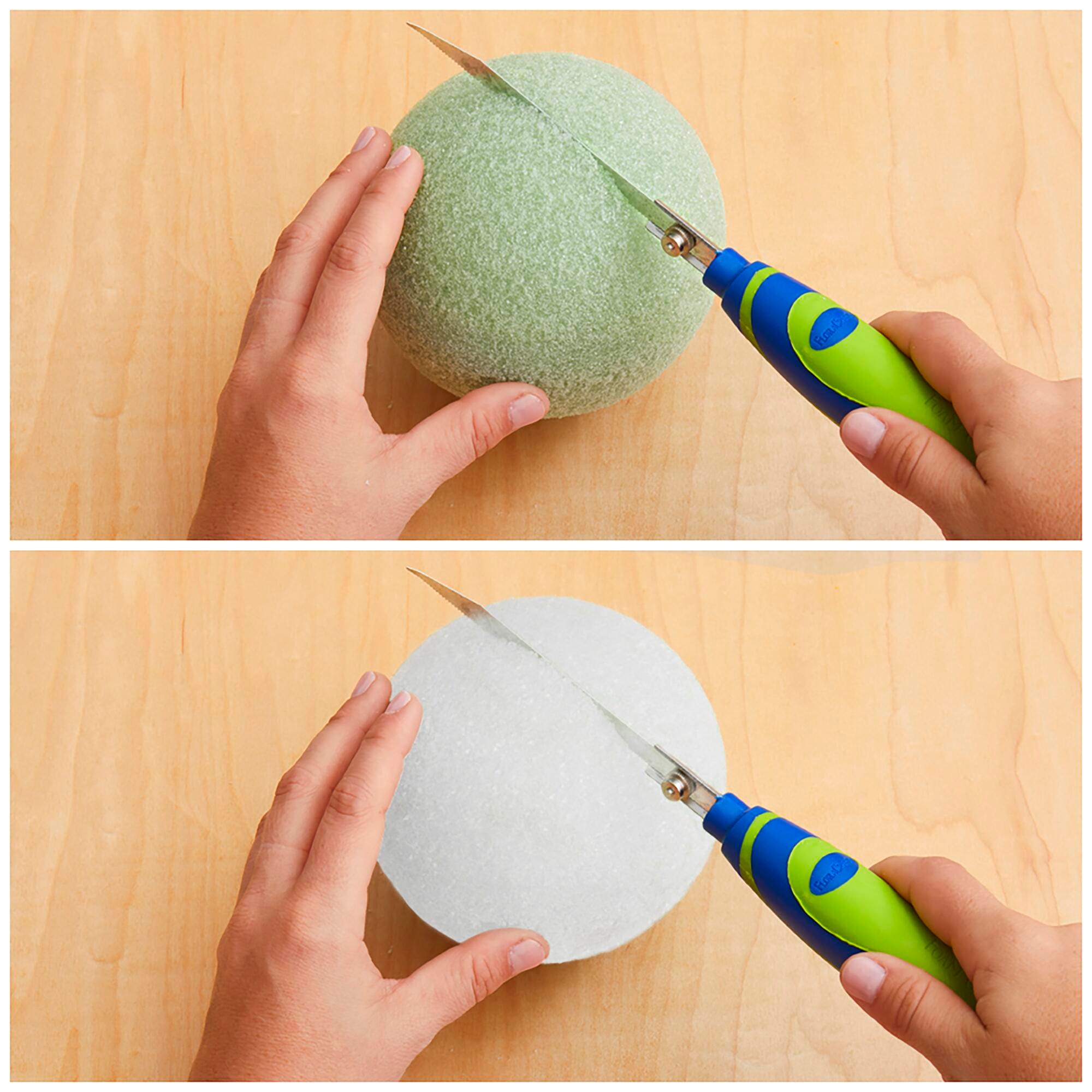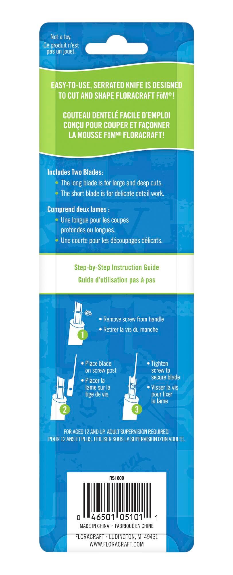 The FloraCraft Foam Cutter is used to easily cut FloraCraft Foam into custom shapes. The Foam Cutter comes with two serrated blades: a narrow, 1.3” blade for cutting intricate details and a wider, 4.25” blade for heavier-duty and longer cutting. Both blades are designed to cut and shape extruded polystyrene (XPS) foam to create unique, lightweight projects for special events, including weddings, birthdays, engagement parties, baby and bridal showers and graduations as well as holidays like Christmas and Halloween! Plus, the Foam Cutter comes with built-in storage in the non-slip handle to safely store both blades when not in use. This package includes one Foam Cutter with two blades.