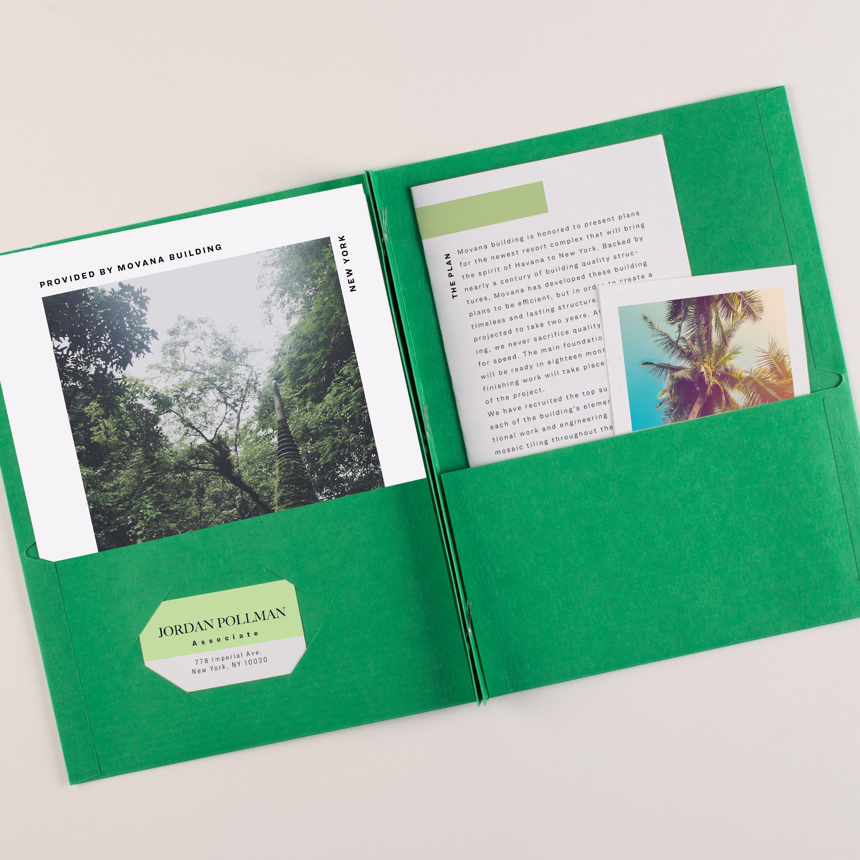 These Two Pocket Folders from Avery are a vibrant, bright green for easy organization in the classroom, office, or home. The folders are constructed using sturdy textured paper that reduces the look of wear and tear. Each folder holds up to 70 sheets of letter-size paper, 35 per side, or 50 in the center-mounted fasteners with 10 sheets in each pocket. These handy folders are perfect for important presentations, school projects, or keeping important documents organized at home. The folders are also easy to customize thanks to die-cut business card holders on the left pocket.Features
