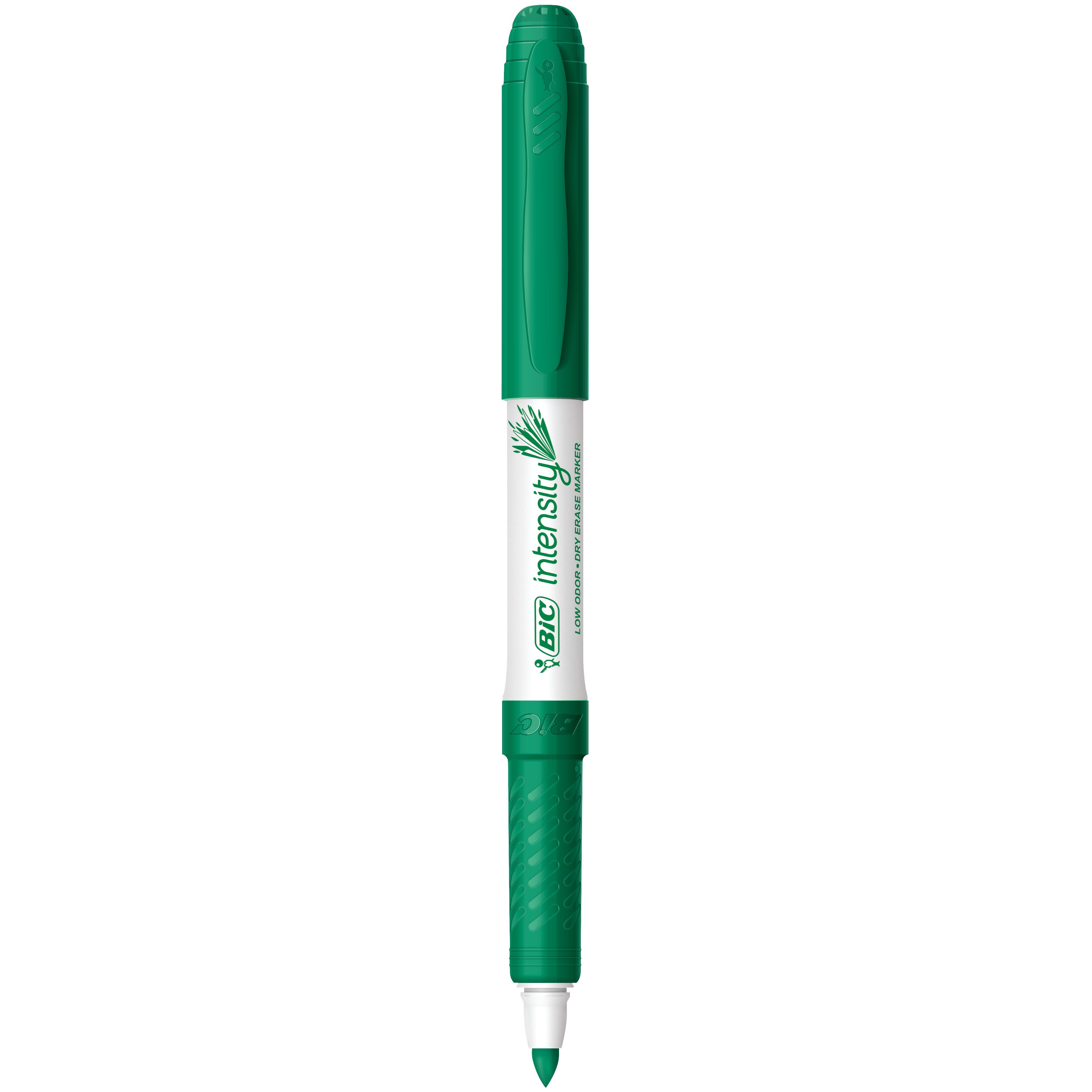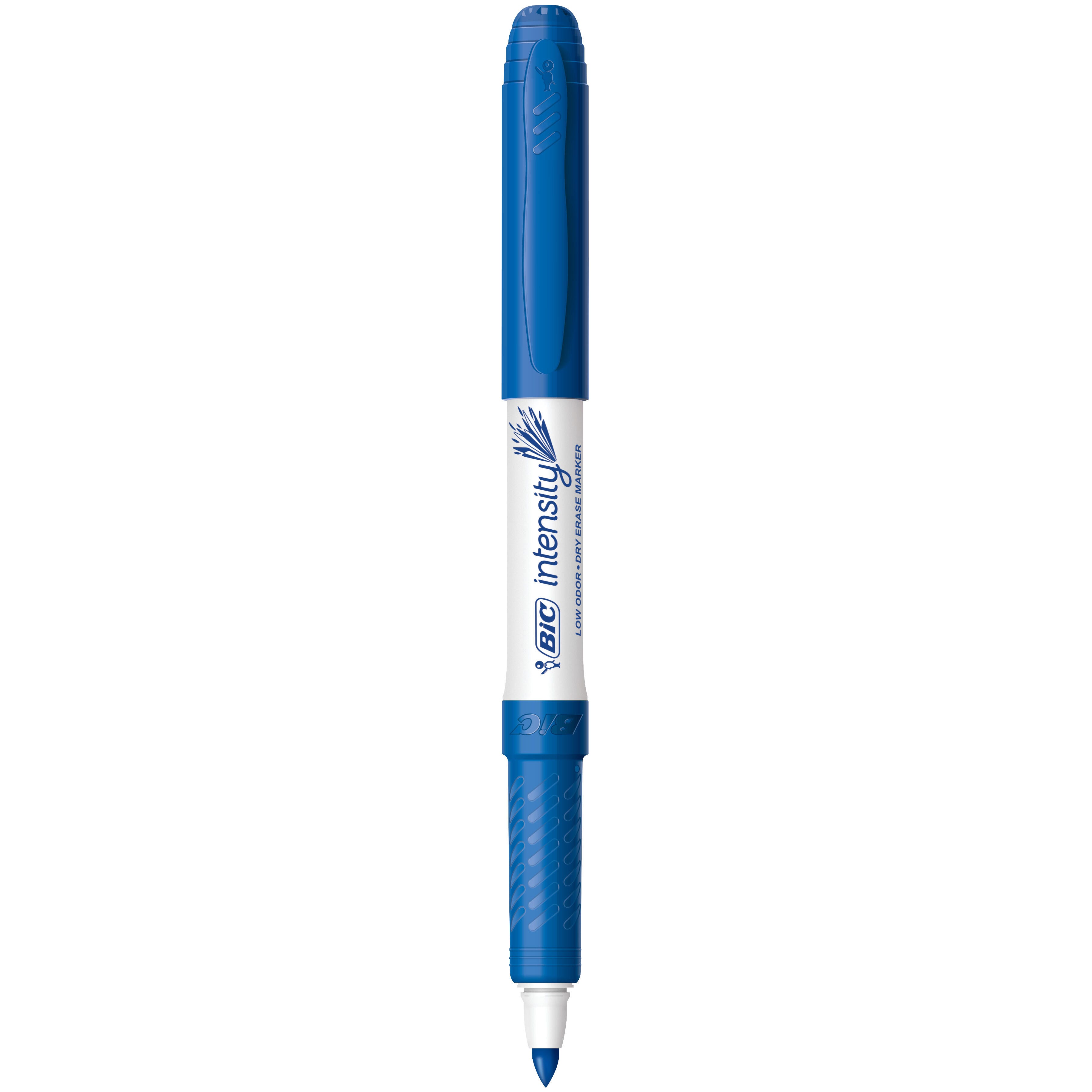 The BIC Intensity Low-Odor Dry-Erase Markers provide smooth, clean lines that bring your ideas to life on non-porous surfaces. They feature an ergonomic barrel design with a rubberized grip for enhanced writing comfort and control. These nontoxic markers have a fine tip that delivers precise lines for detailed writing or drawing. This assorted set of 4 markers includes 1 each of red, blue, green, and black.