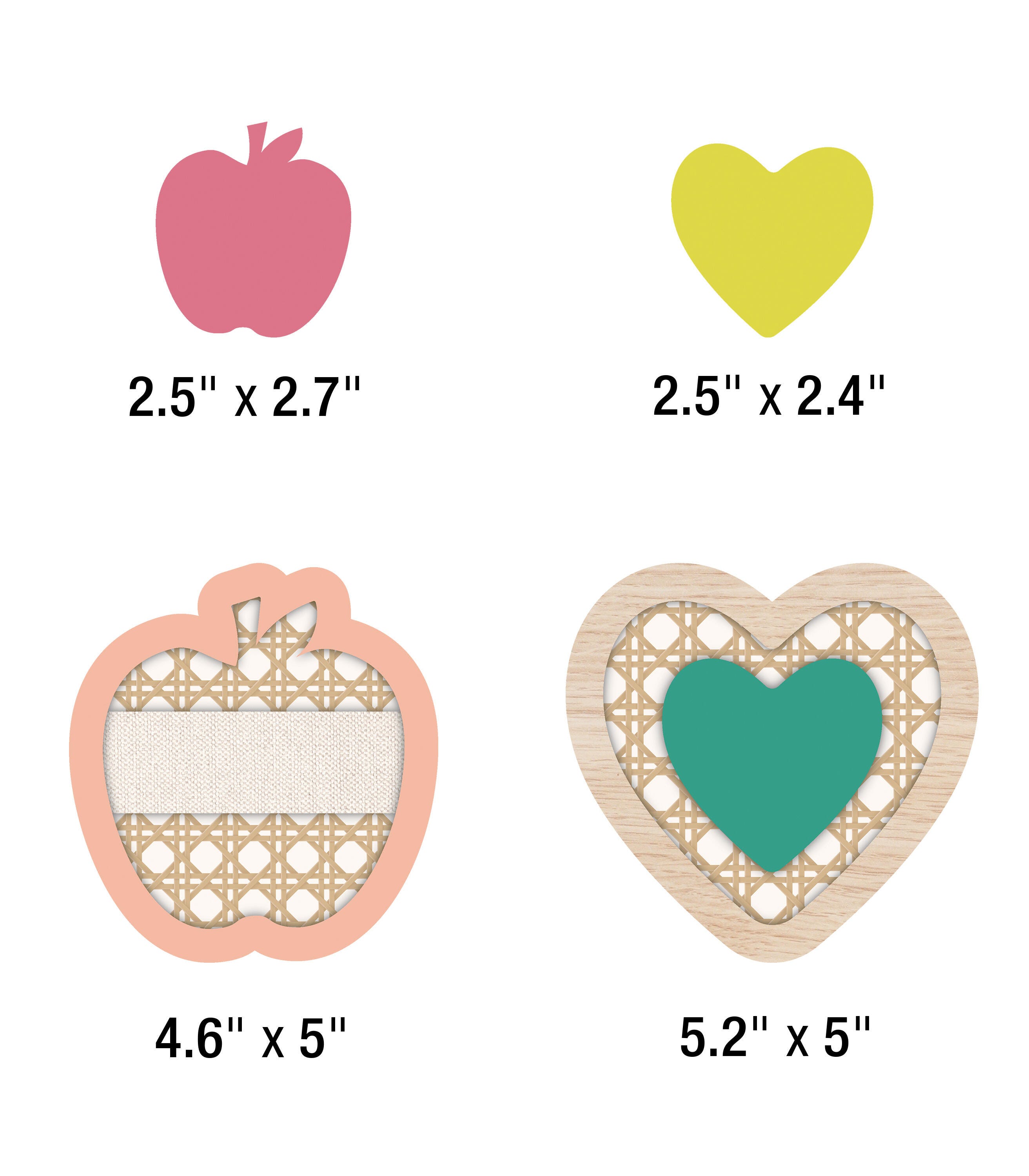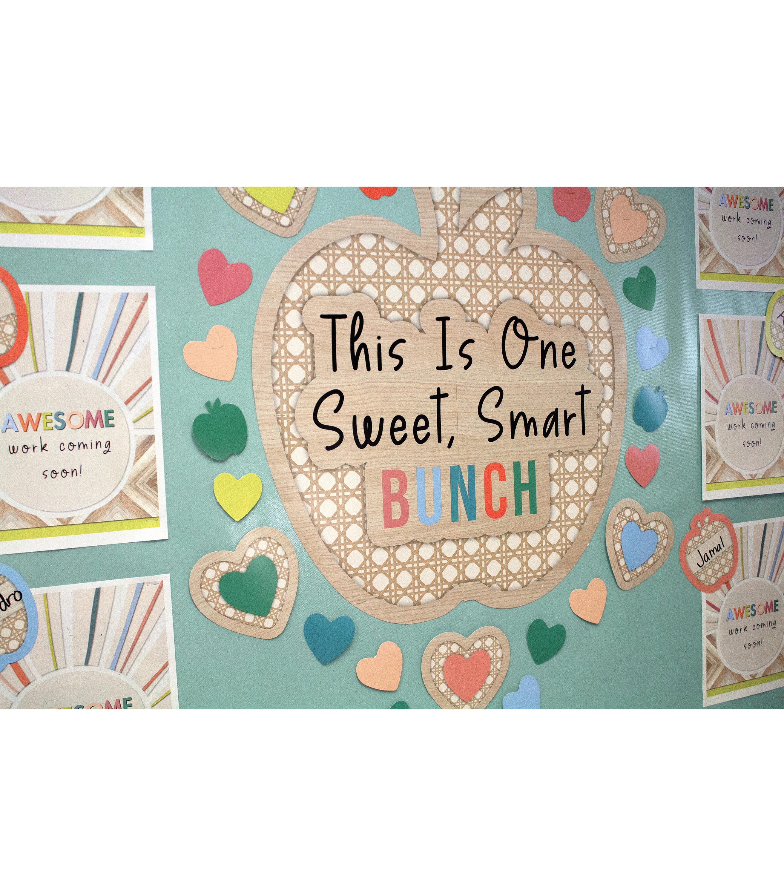 This 59-piece bulletin board set includes a header assembled from 2 pieces (assembled size: 25-1/5 x 9-1/5 inches), a large apple, assembled from 3 pieces (assembled size: 21-2/5 x 23-3/10 inches), 15 medium apple cutouts (4-3/5 x 5 inches), 15 medium heart cutouts (5-1/5 x 5 inches), 6 small apples cutouts (2-1/2 x 2-7/10 inches), and 18 small heart cutouts (largest: 2-1/2 x 2-2/5 inches, smallest: 2-3/10 x 2-1/5 inches). Perfect for bulletin board, white board, and cork board displays, the 59-piece modern classroom décor set features a “This Is One, Sweet, Smart Bunch” inspirational message to help encourage students while showcasing their work throughout the school year.Features