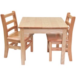 This Childcraft® Hardwood Table and Chair Set offers a sturdy and child-friendly workspace perfect for early childhood environments. Ideal for reading, art, and group activities, this set includes a square table and two 14-inch ladderback chairs. The children’s table is crafted with a solid maple apron and legs for long-lasting durability, while the smooth, clear-coated surface resists stains and is easy to clean. Sized for toddlers and young learners, this set encourages independence and collaborative play. The classroom table measures 24 W x 24 D x 22 H inches. Chairs arrive fully assembled; simple leg assembly required for table.Features