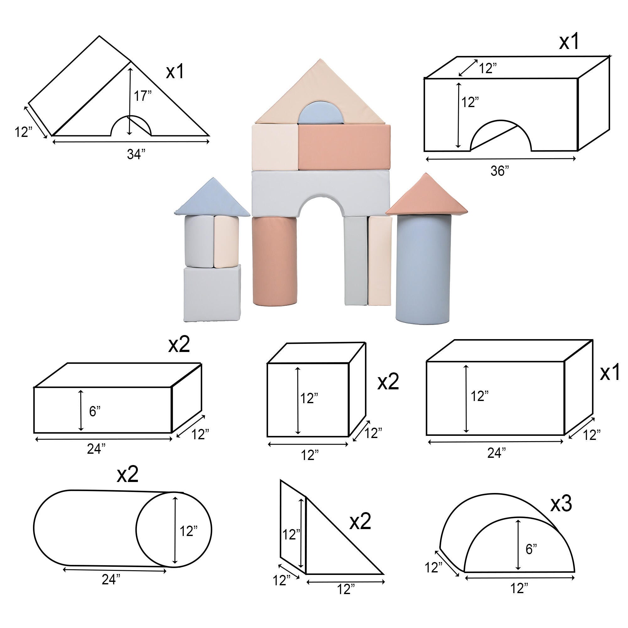 These 12-inch blocks are designed to encourage future architects and inspire further STEAM learning in playrooms everywhere. Designed for the young visionary, these oversized blocks encourage grand-scale building and collaborative play in early childhood spaces. Storage cart not included. This set of 14 blocks is available in several color assortments to best fit your space. Please select the option that fits best when ordering.Features
