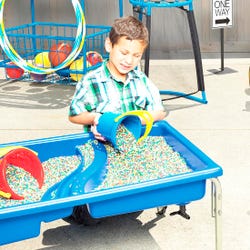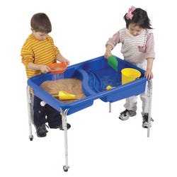 This 18-inch high sand and water table offers quality and affordability! This double basin lets children explore the properties of water and sand without making a big mess. Each of the two basins has a drain and a bottom textured with fish, crabs, and starfish. Both basins are divided by a waterfall to allow for observation of water flow. For this table, 10 pounds of Kidfetti (item sold separately 1428020 & 1380276) or 25 pounds of sand is recommended. The blue tub is supported by a sturdy steel frame and has casters (2 locking and 2 non-locking) for easy mobility.Features