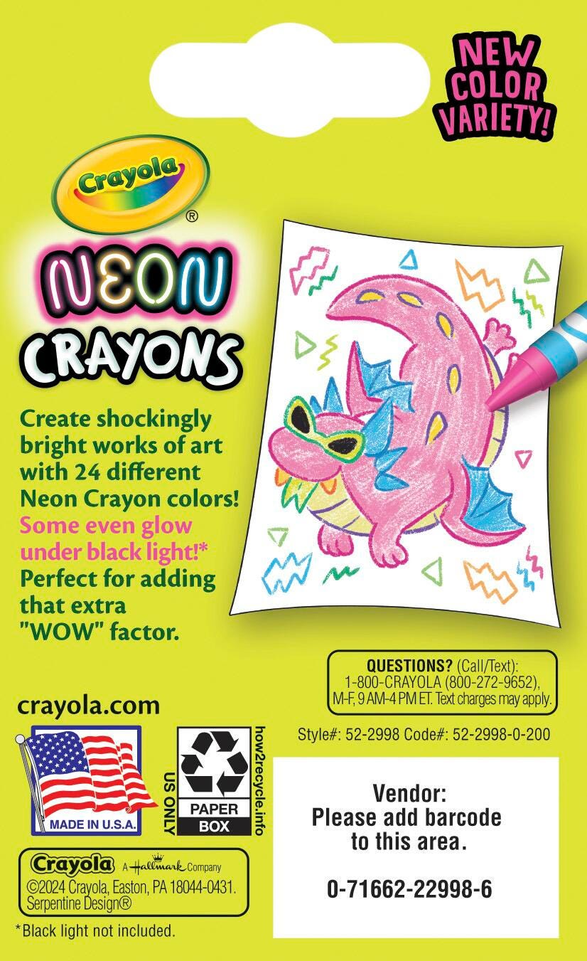 Light up your artwork with this pack of Crayola Neon Crayons, where every color is a burst of fun waiting to happen. These crayons help young artists bring any fluorescent fantasy to life, especially under a blacklight. Ideal for every mini Monet, these Crayola Crayons are a must-have for lively school assignments and dynamic playtime at home and are built to deliver hours of fun without breaking. This set contains 24 crayons in an assortment of colors.Features