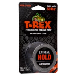 With its ferociously strong adhesive, T-Rex heavy duty mounting tape offers an easy alternative to nails, screws, staples, or glue while still getting the same holding power. A mere 4 inches of this tape can hold up to 2 pounds of weight. Entire roll holds up to 30 pounds! This outdoor mounting tape works on a variety of surfaces and in different types of weather so you can use it all year round. Note that the final strength of adhesion is reached after 24 hours. Tape holds up in temperature ranges from -40 degrees to 200 degrees Fahrenheit but must be applied first in temperatures above 50 degrees Fahrenheit. Black all-weather tape comes on a roll and measures 60 L x 1 W inches.Features