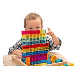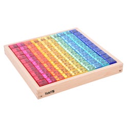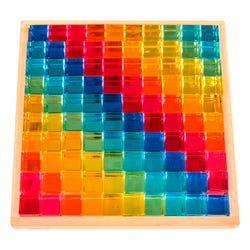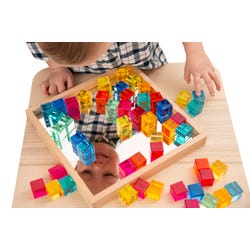 This TickiT® Gem Cube Mirror Tray set features 100 translucent acrylic cubes and a wooden mirror tray. Watch the colors dance when you hold them up to the light. This set is perfect for activities related to color recognition, color mixing, patterning, sequencing, and more. The mirror base reflects light back through the gem cubes for bright and colorful creative play. It also adds another element of sensory stimulation for exploring reflection. For children three years and older. Tray measures 10-7/10 L x 10-7/10 W x 1 H inches. Each cube measures 1 square inch.Features