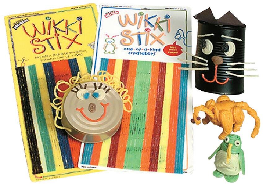 Unique wax-coated yarn comes in 6 inch strips that can be cut with scissors and bent easily into any shape for hours of fun. Pieces can stick to just about any surface and can effortlessly be removed without permanent residue. Reusable cords won't break, stain, melt or freeze. Make yarn-type paintings or outline letters, numbers and maps. Twist into 3-D sculpture. Comes in an assortment of primary colors: red, yellow, blue and green. Non-toxic. Ages 3 and up.Features