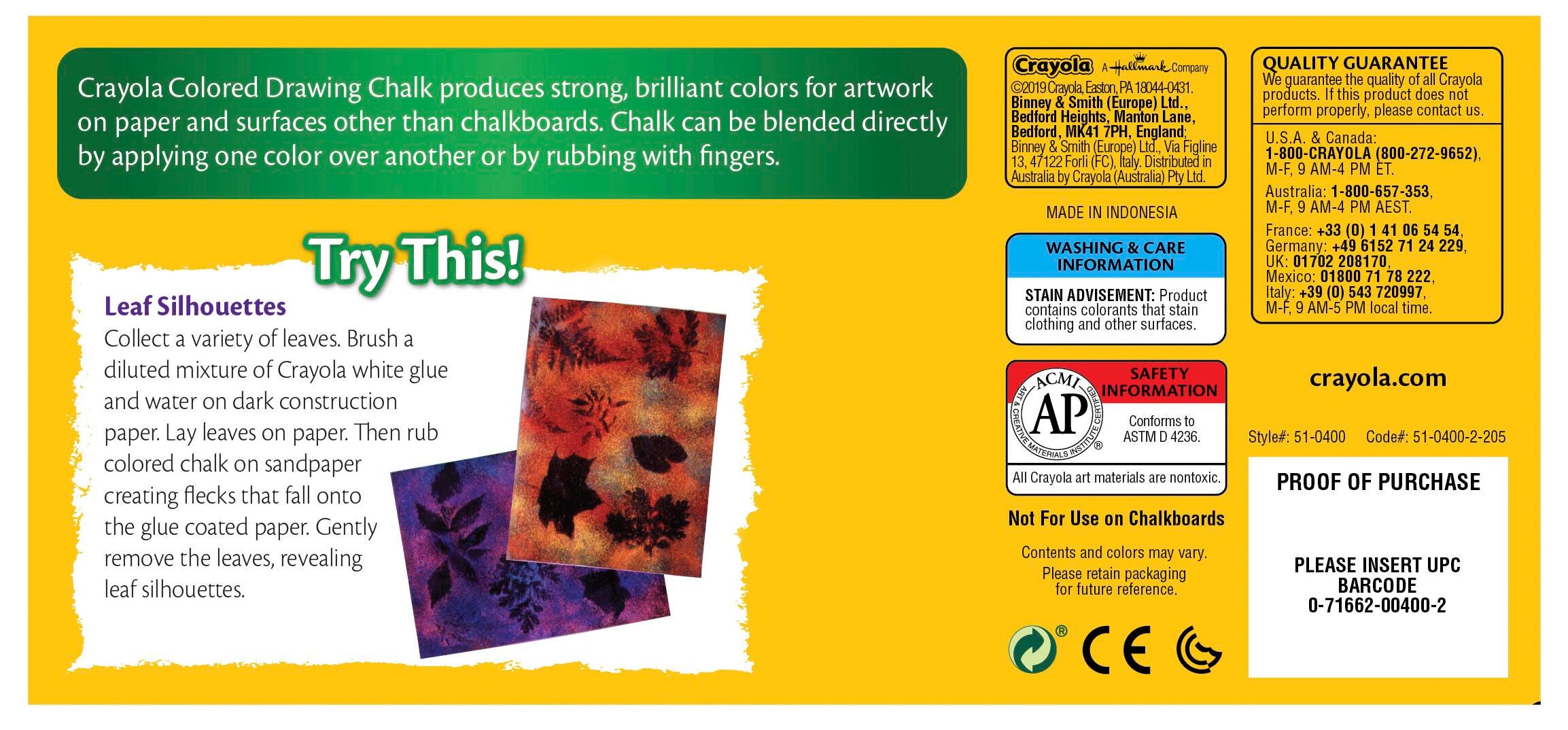 Make your creative mark with Crayola Drawing Chalk! This chalk produces brilliant color on cardboard, paper bags, craft paper, non-glossy papers, and more. Enhance your design by blending chalk marks by applying one color over another or by rubbing them together with your fingers. Try them with techniques like dry-chalk drawing, wet-chalk painting, and stenciling. This chalk is not suitable for use on chalkboards. This set includes 144 chalk sticks, 6 each in an assortment of 24 colors.Features