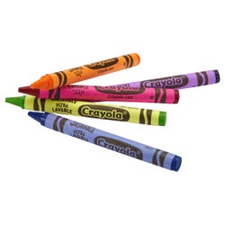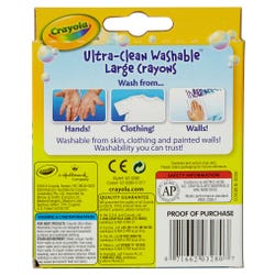 Crayola Ultra-Clean Washable Crayons are specially formulated to wash clean from skin, clothing, and painted walls. Box contains a variety of colors, from classic to bright, and features ColorMax, making them the brightest, truest colors yet. Large size crayons measures 4 x 7/16 inches and are easier for young children to hold. AP certified non-toxic.Features