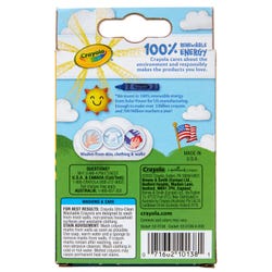 This box of Crayola Ultra-Clean Washable Crayons delivers the classic art tool that students and teachers love, now with improved washability. Specially formulated to wash clean from skin, clothing, and painted walls, these child-friendly crayons provide hours of colorful fun, with bold and true color, a smooth formula, and a durable construction. This pack contains 24 crayons in assorted colors.Features