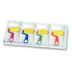 Creativity Street Large Foam Paint Roller Set with paint tray can be cleaned with ease. Four 3 in rollers with 6 in long handles features checkerboard, solid and 2 sizes of stripes design. 4 well plastic paint tray has a dimension of 17-1/2 in x 8 in x 1 -1/2 in. Sold as 4 per set.Features