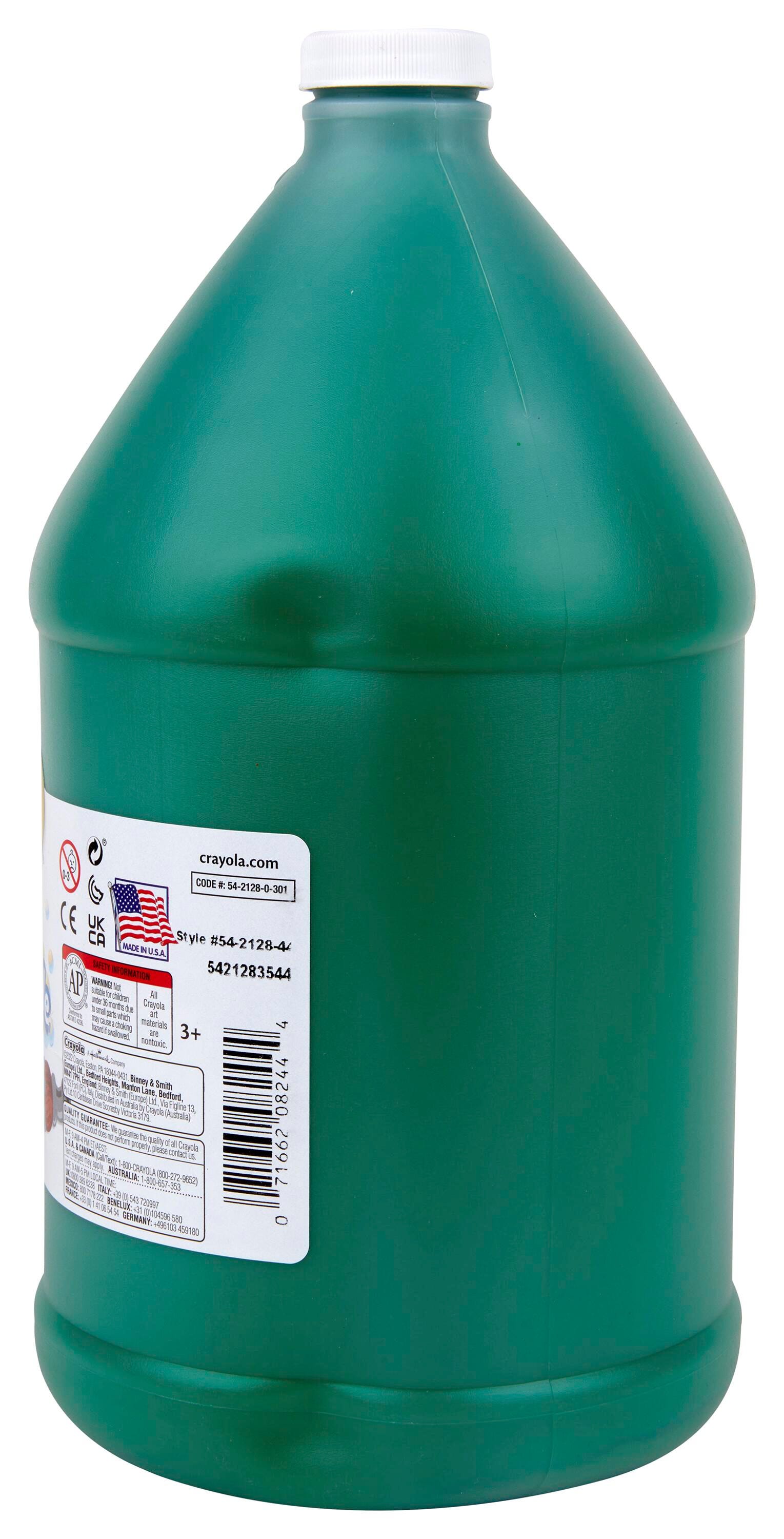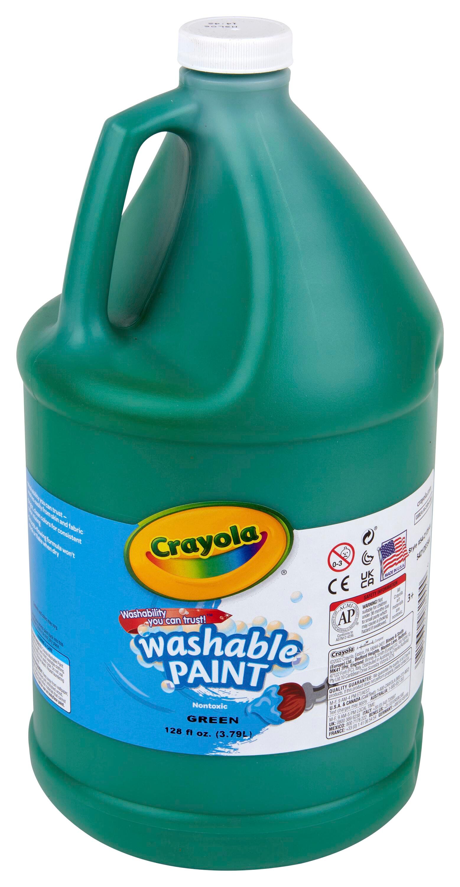 Enhance any artwork with high-quality and vibrant Crayola Washable Paint! The paint's thick, creamy consistency provides rich color and an opaque covering on most surfaces. Plus, this child-friendly paint is easily washed from skin and almost all clothing. This bold green paint comes in a 1 gallon plastic jug with a screw lid so it is easy to pour—great for large groups or big projects in the classroom, childcare center, or home.