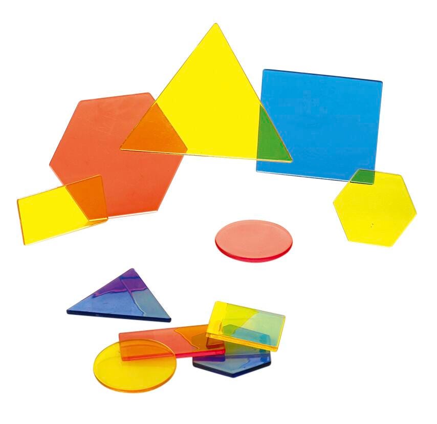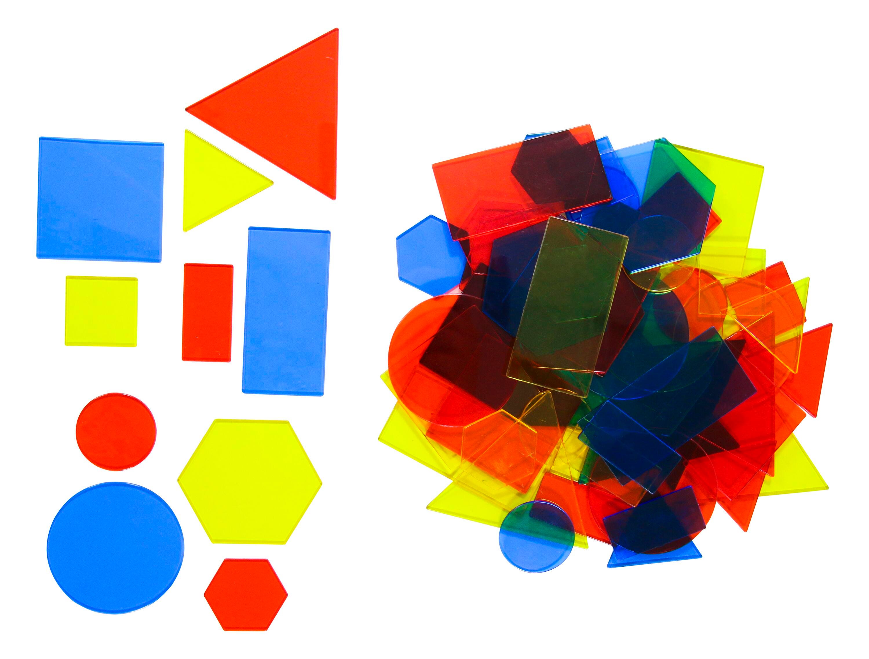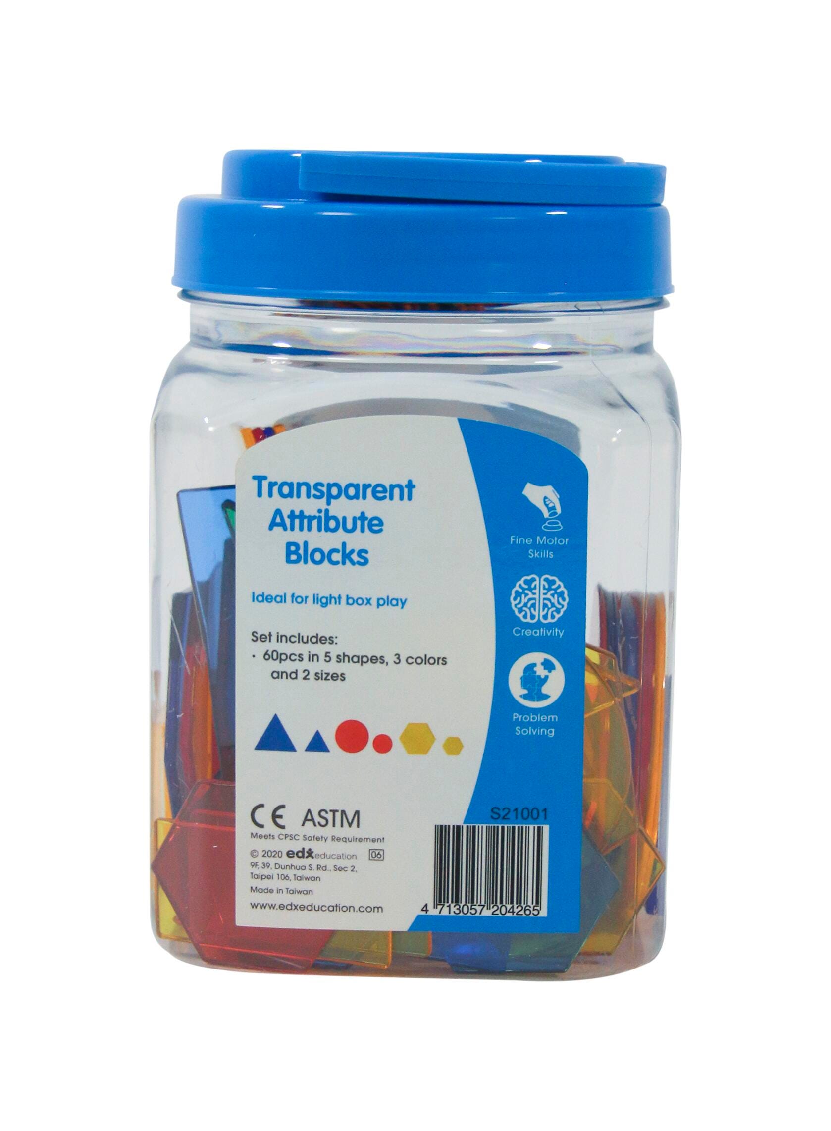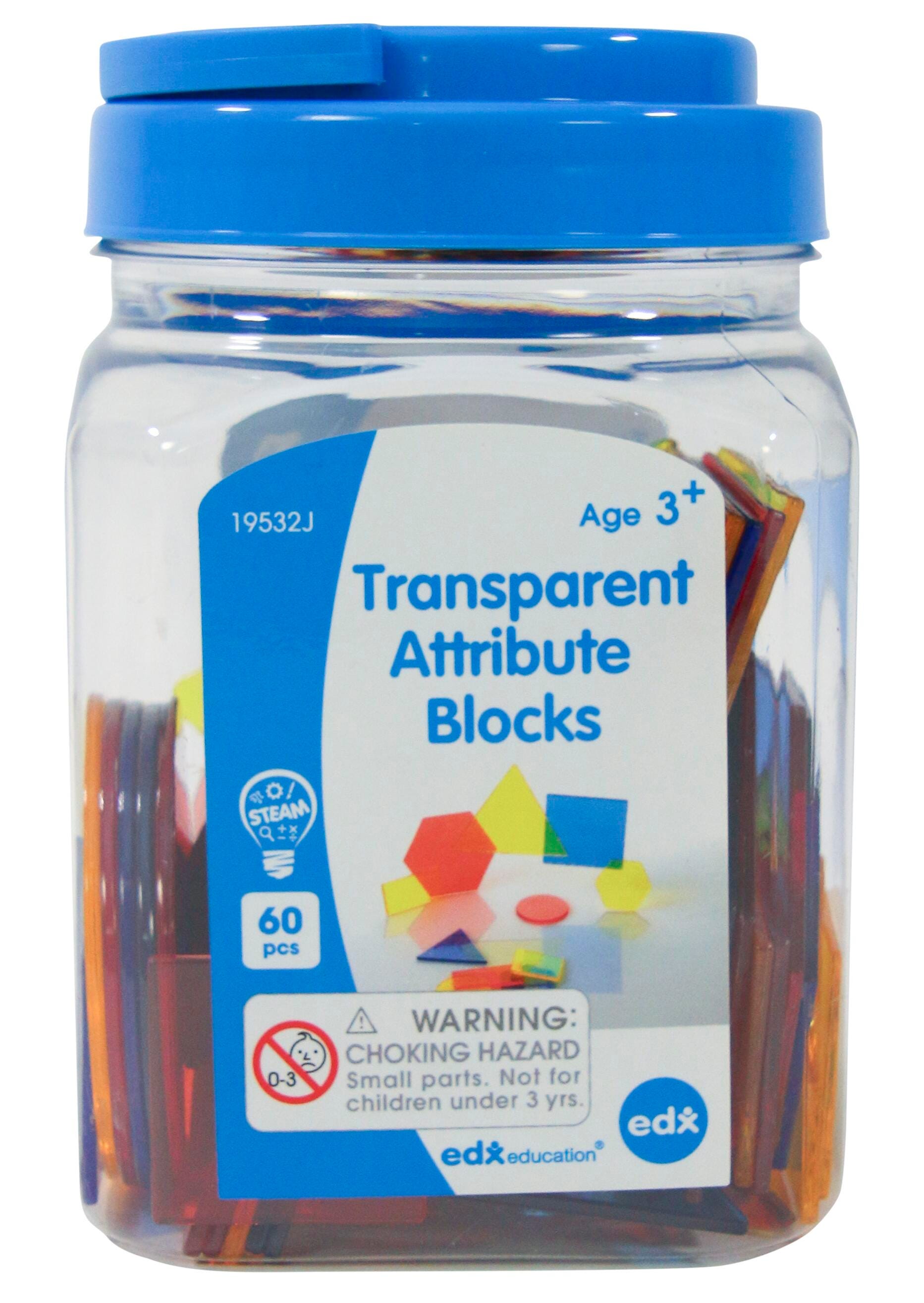 Description Edx Education Transparent Attribute Blocks are ideal for light box play, in which children can explore colors as the light goes through the transparent shapes. These blocks are perfect for teaching basic math concepts and 2D geometric shapes. Transparent blocks come in three colors: red, blue, and yellow. Sizes range from 1-3/4" through 3" in circles, squares, triangles, rectangles, and hexagons. Ages 3+Features Packaged in a storage jar with lid and handle Encourages game play Makes an excellent screen-free gift