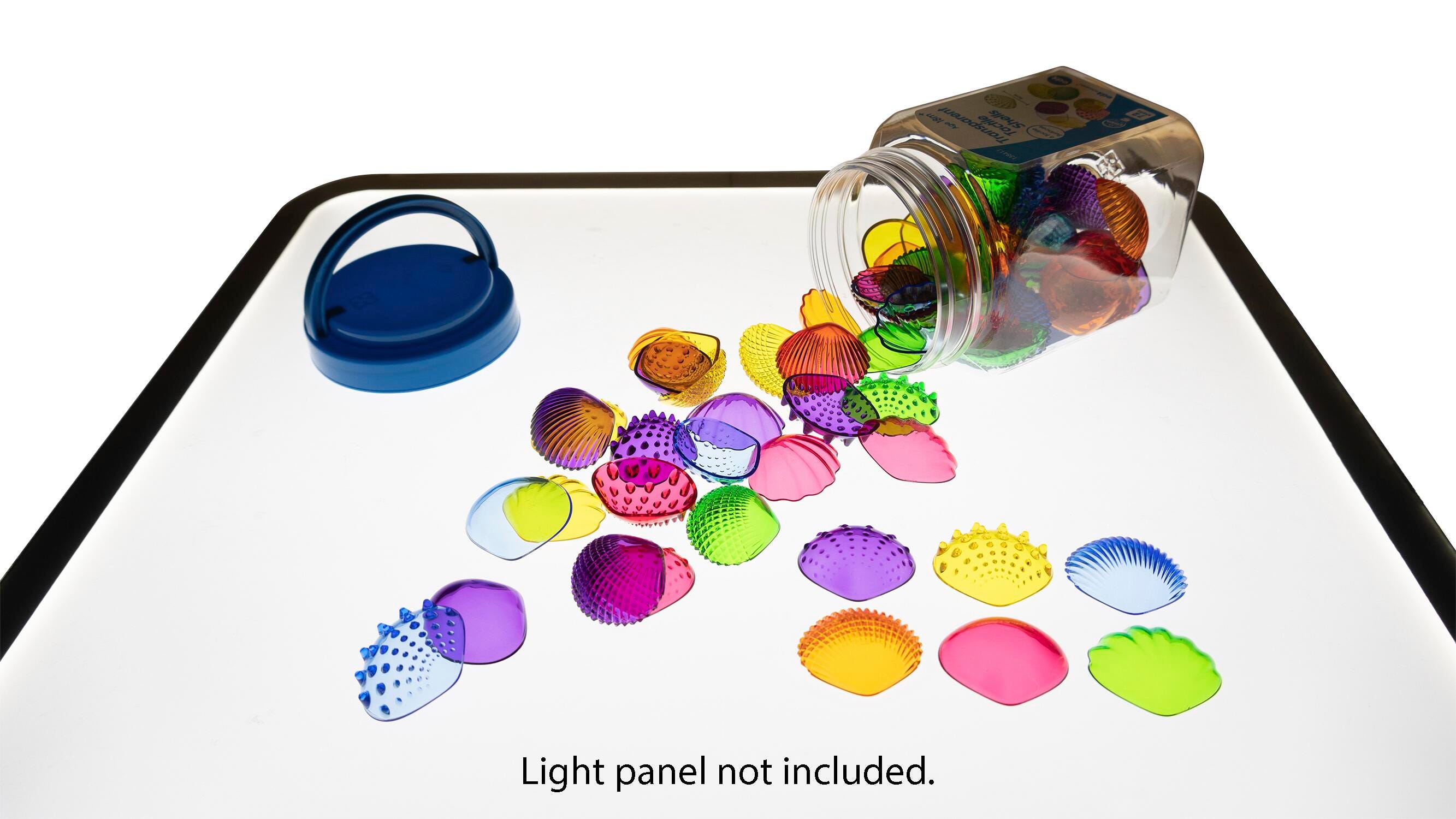 These multicolored, see-through shells are perfect for counting, sorting, patterning, comparing, matching and classifying. Ideal for tactile learners, these shells are a great resource to explore STEM concepts via light panels or sensory bins. Foster fine motor skills as children use these hands-on manipulatives to learn addition, subtraction and symmetry. Made with durable plastic and rounded edges, these shells are the perfect math manipulative for home or classroom learning. Transparent Tactile Shells are packaged in a plastic jar with lid for easy cleanup and storage. Size: 1.3"L x 1.6"W.Features