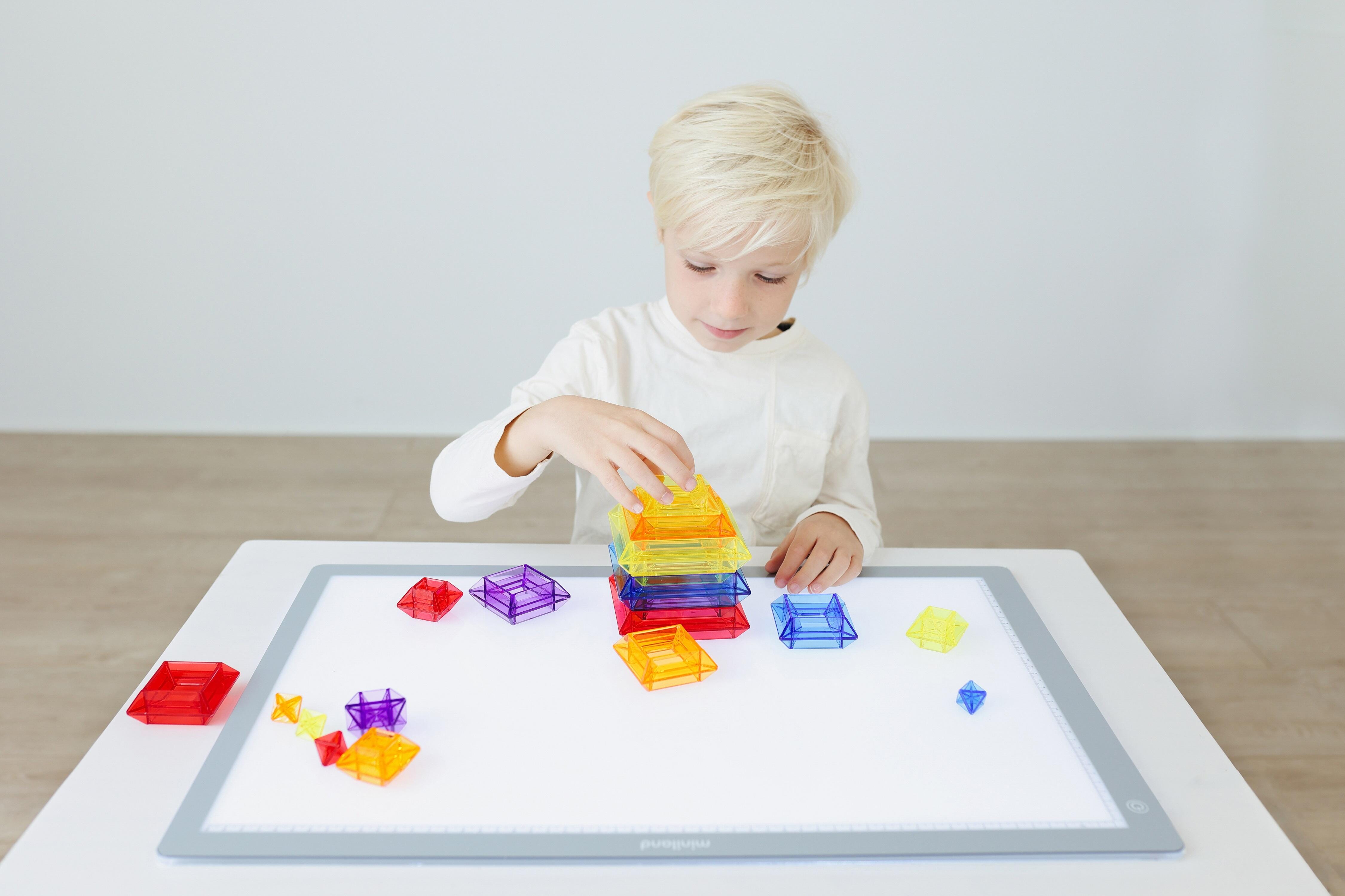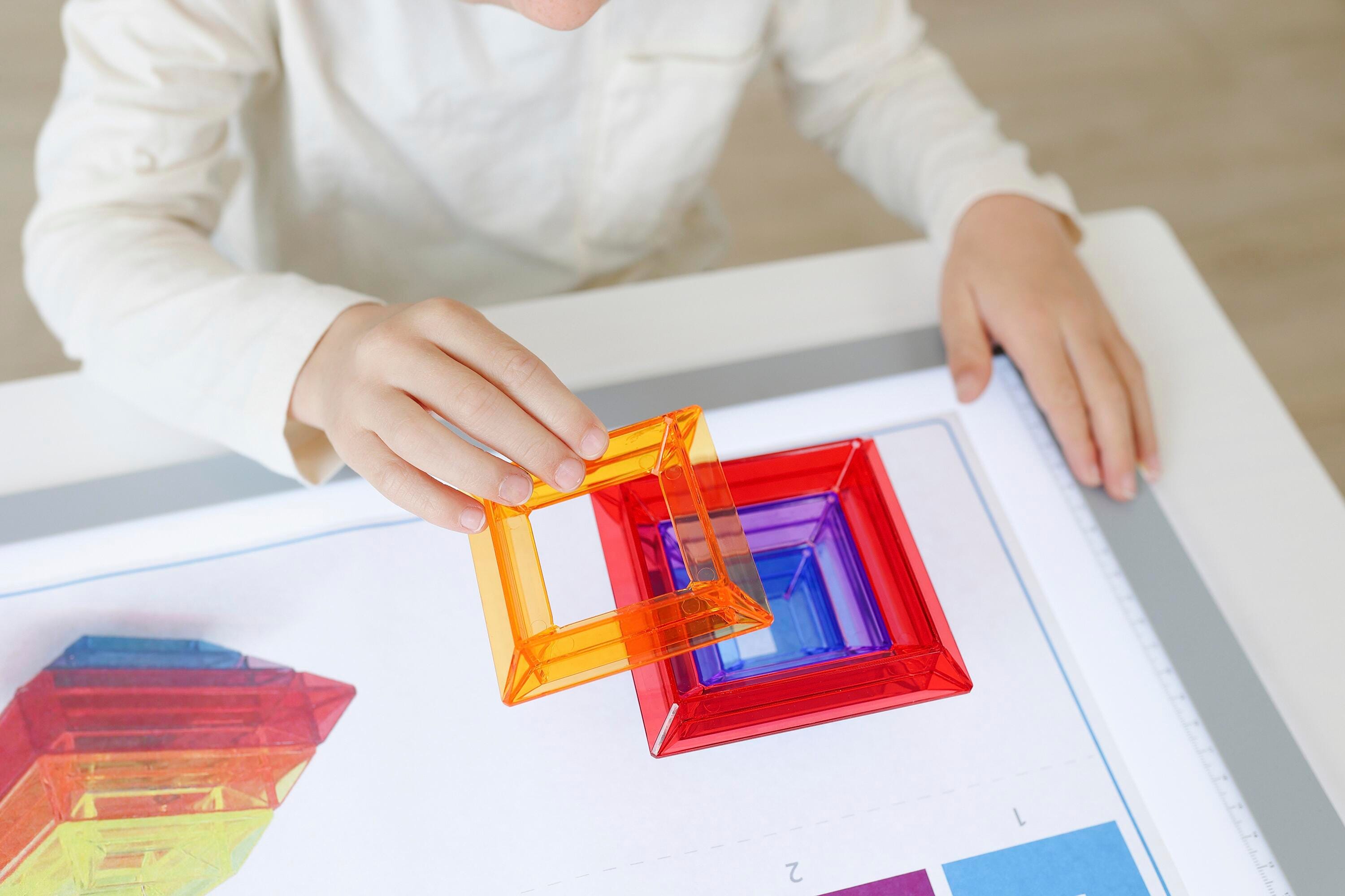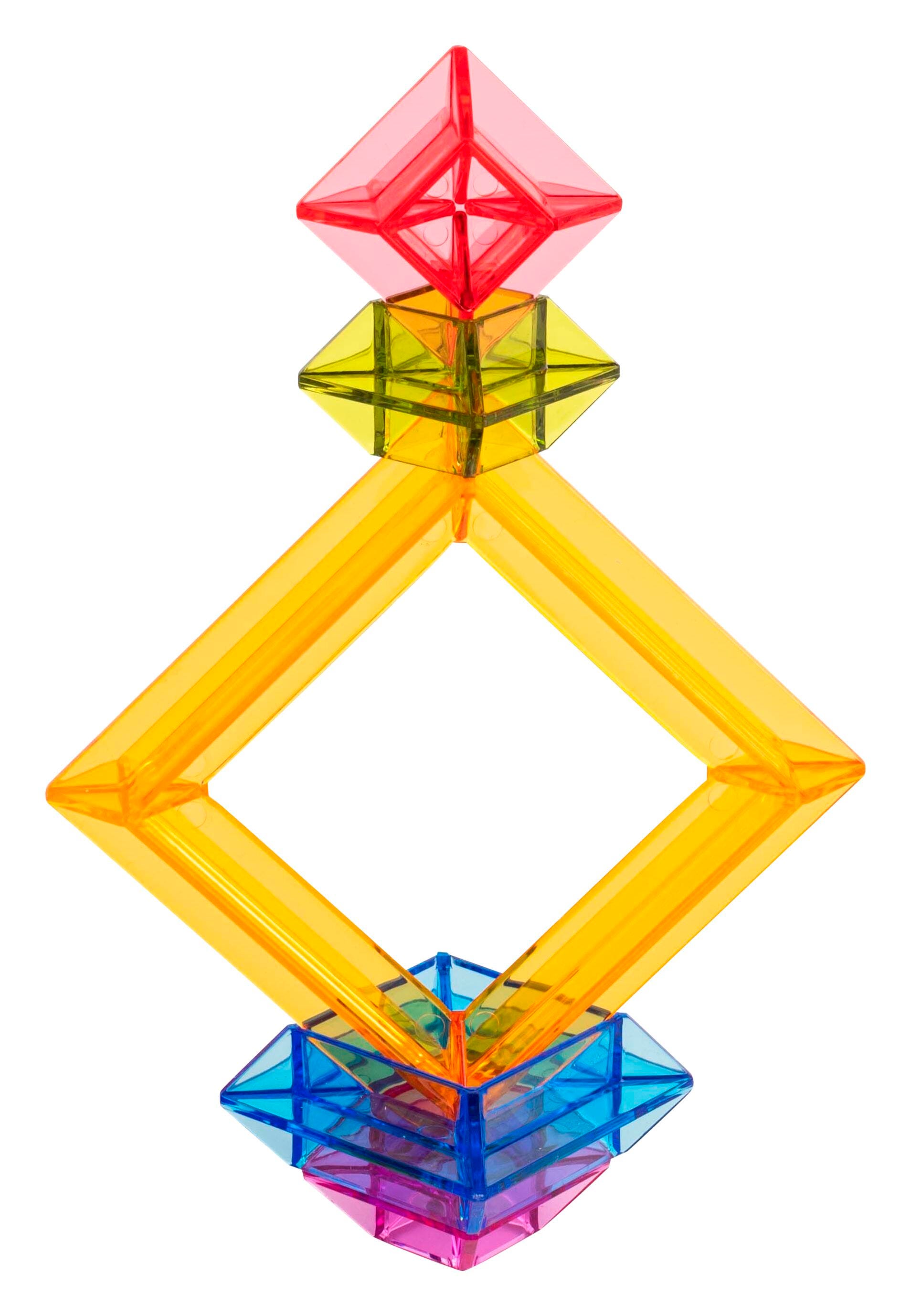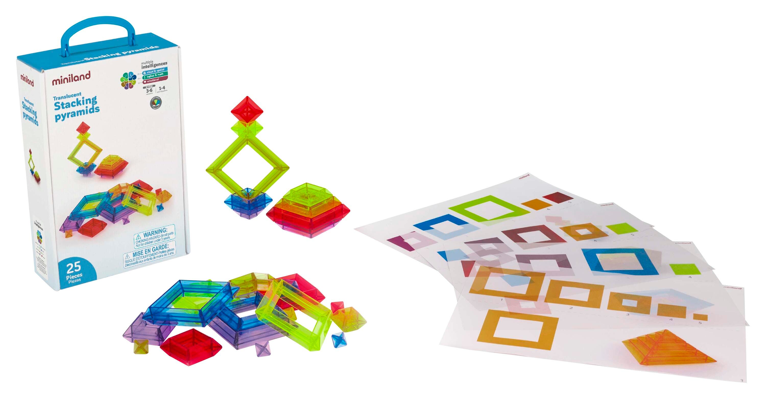Set of 25 translucent pieces that can be used to stack and fit together to build multi-colored pyramids. It comes with transparent activity sheets.Features