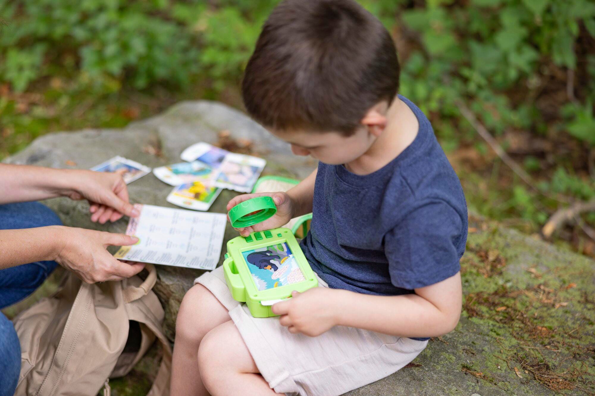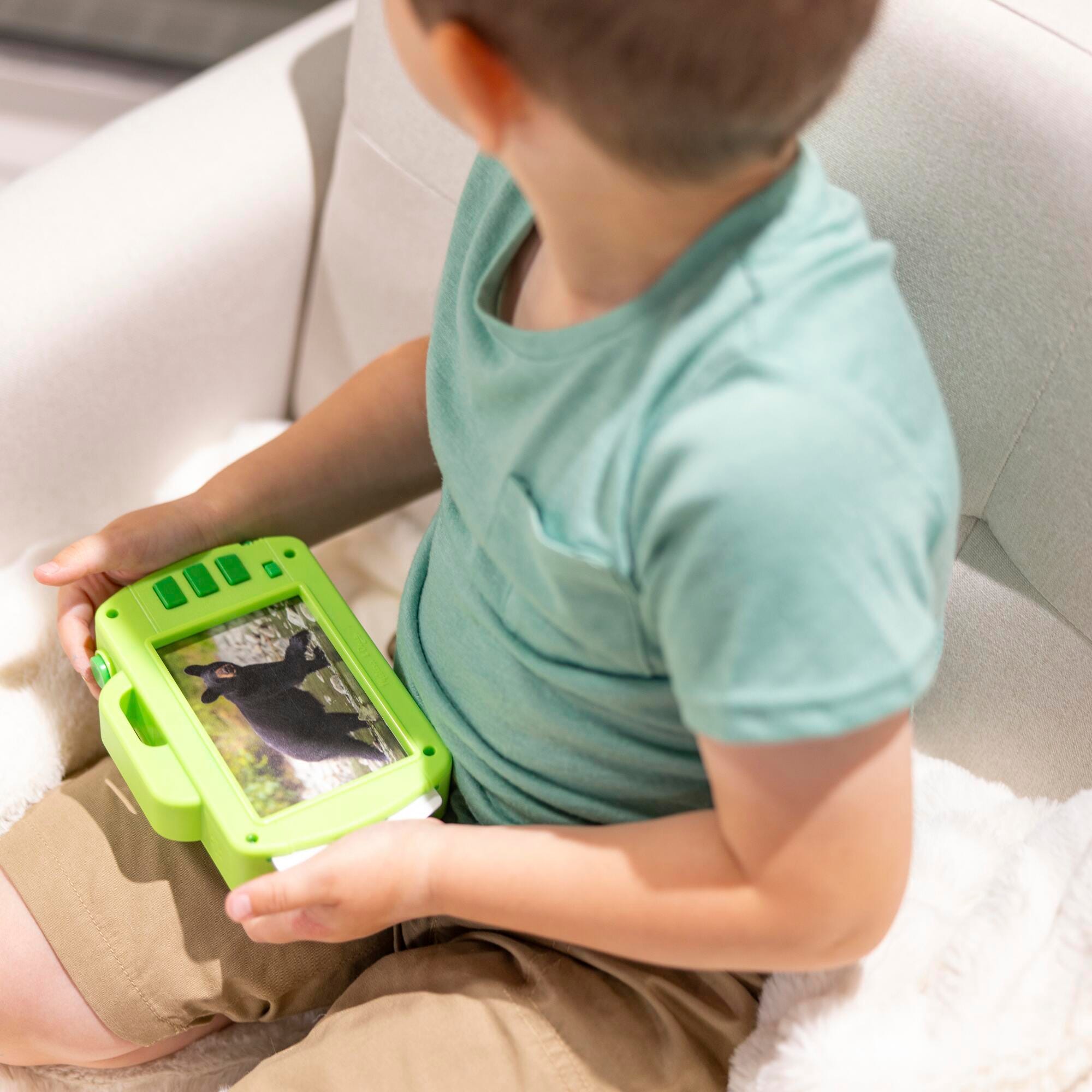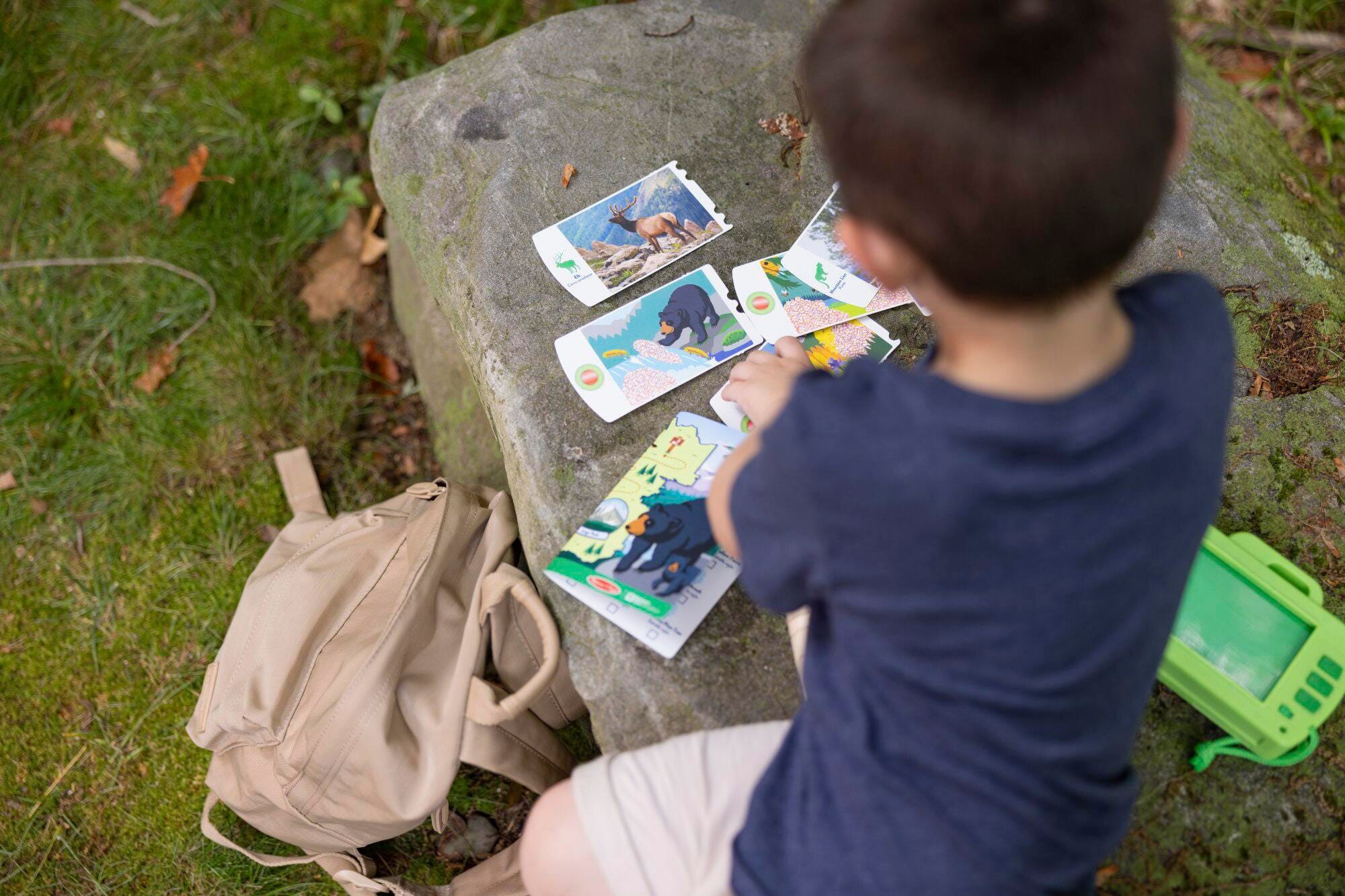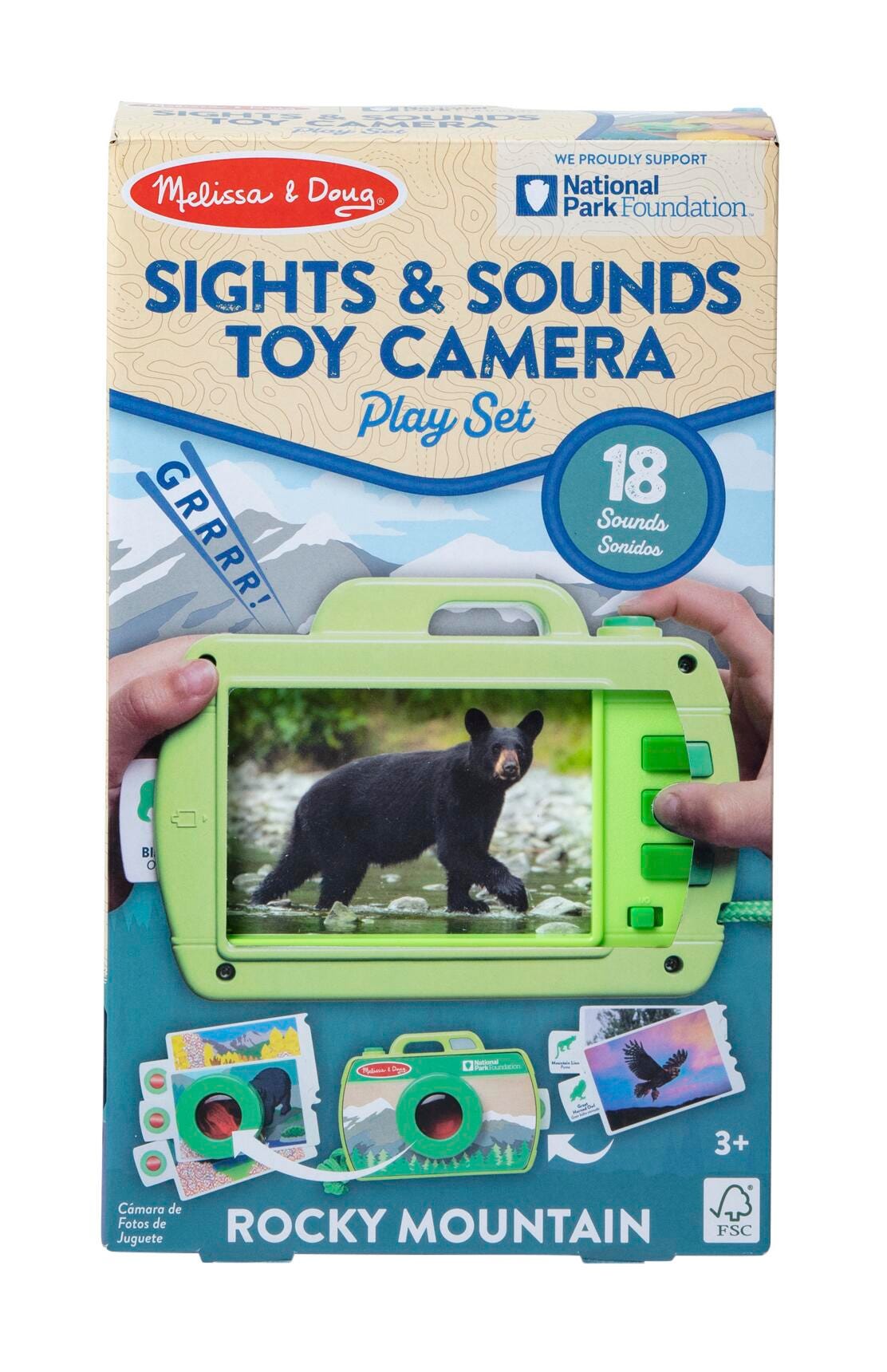 Take an exciting imaginative journey through Rocky Mountain National Park and discover the animals that live there and the sounds they make! Slide a photo card into the wooden play camera and click the shutter button to activate the flash. Press the buttons on the back to hear three nature and animal sounds per card (sounds are unique to each of the six photos)! The removable red lens magnifier lets children three and older search for plants and animals hidden in scenes on the backs of the photo cards. Children will learn as they play and the reusable activity card includes native animal and plant identification and fun facts in English and Spanish, plus a park map on the back for pretend play adventures. This collection is designed to inspire children to discover the wonder of America’s national parks.