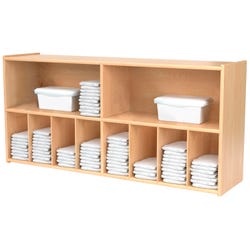 The Childcraft® Wall Mounted Diaper Storage Unit provides a convenient and accessible storage solution for diapers, wipes, and other infant care essentials. Designed to be mounted above a changing station, this sturdy wooden storage unit keeps supplies neatly organized and within easy reach. Removable dividers allow for flexible storage configurations, while multiple cubbies keep individual diaper supplies separate. Crafted from birch plywood with a smooth, ultra-cured acrylic finish, this storage cabinet is easy to clean and built to last. Measures 47-3/4 W x 11-3/4 D x 22-5/8 H inches. Comes fully assembled with mounting hardware included.Features