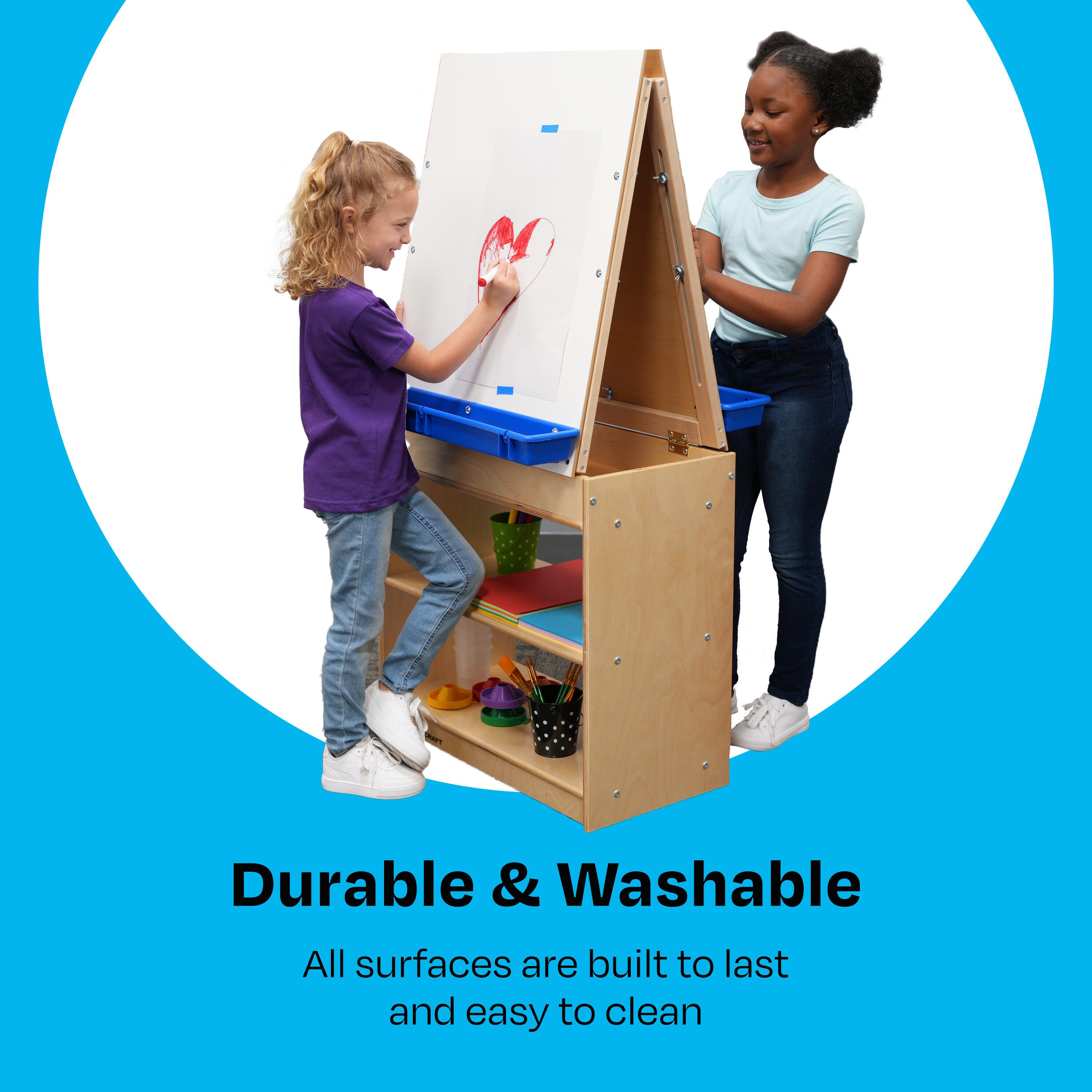 Draw, paint, write, and play with this sturdy art easel with whiteboards and storage shelves. Great for multiple children to work at once.