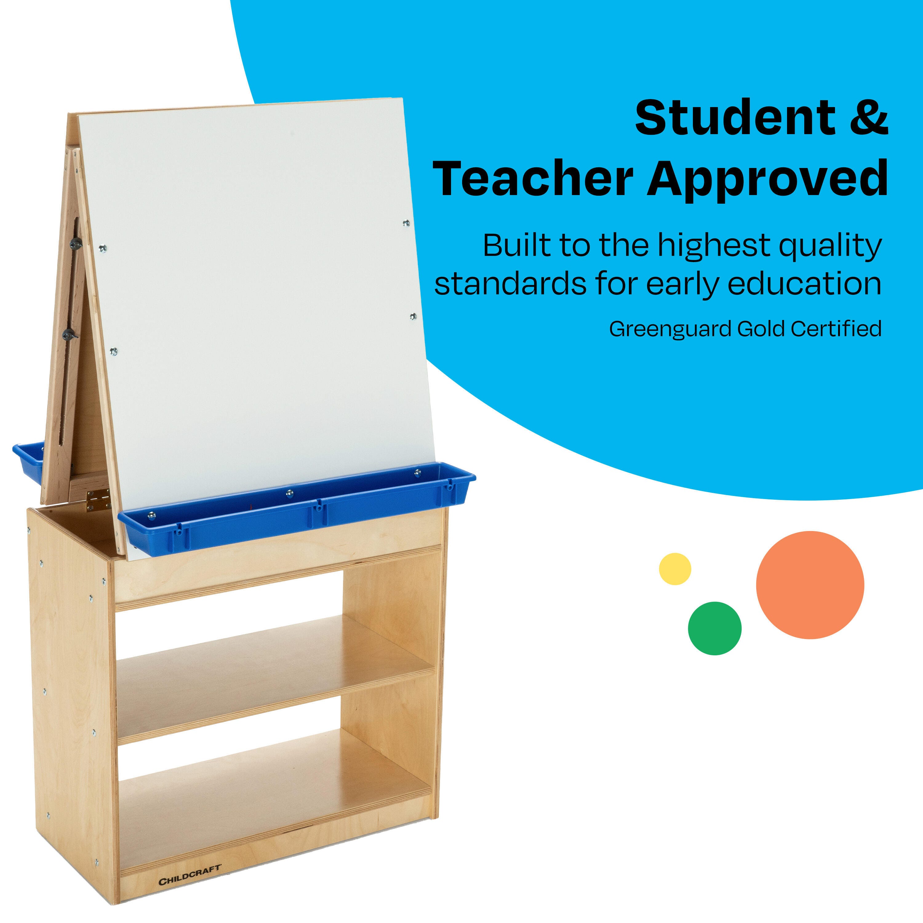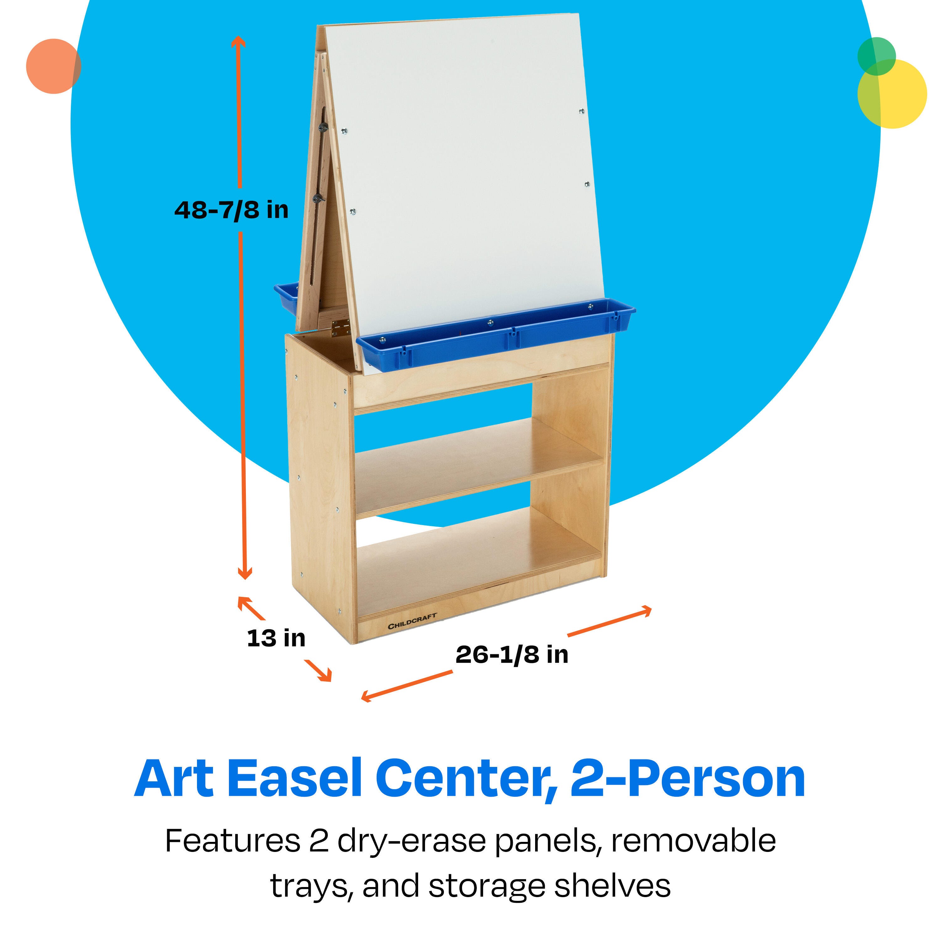 Childcraft® Art Easel Center features two dry erase panels, removable trays, and ample storage. Built with sturdy wooden materials for durability, this easel is designed for years of use. The wooden easel is perfect for writing, drawing, painting, or imaginative play in early childhood and elementary environments. Ample storage below is great for organizing art supplies, paints, markers, finished projects, and more. Simple assembly is required. This children’s easel measures 26-1/8 W x 13 D x 48-7/8 H inches.