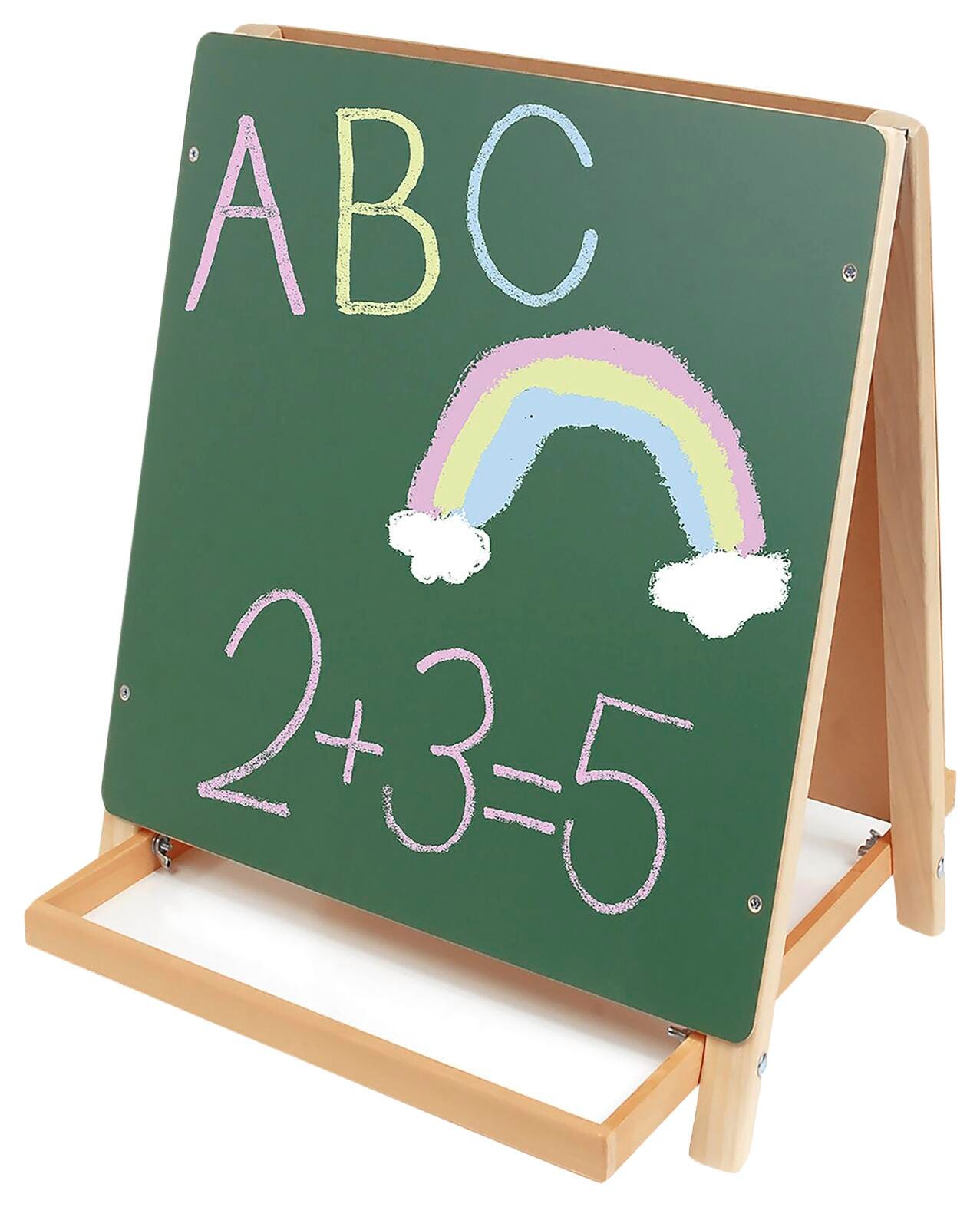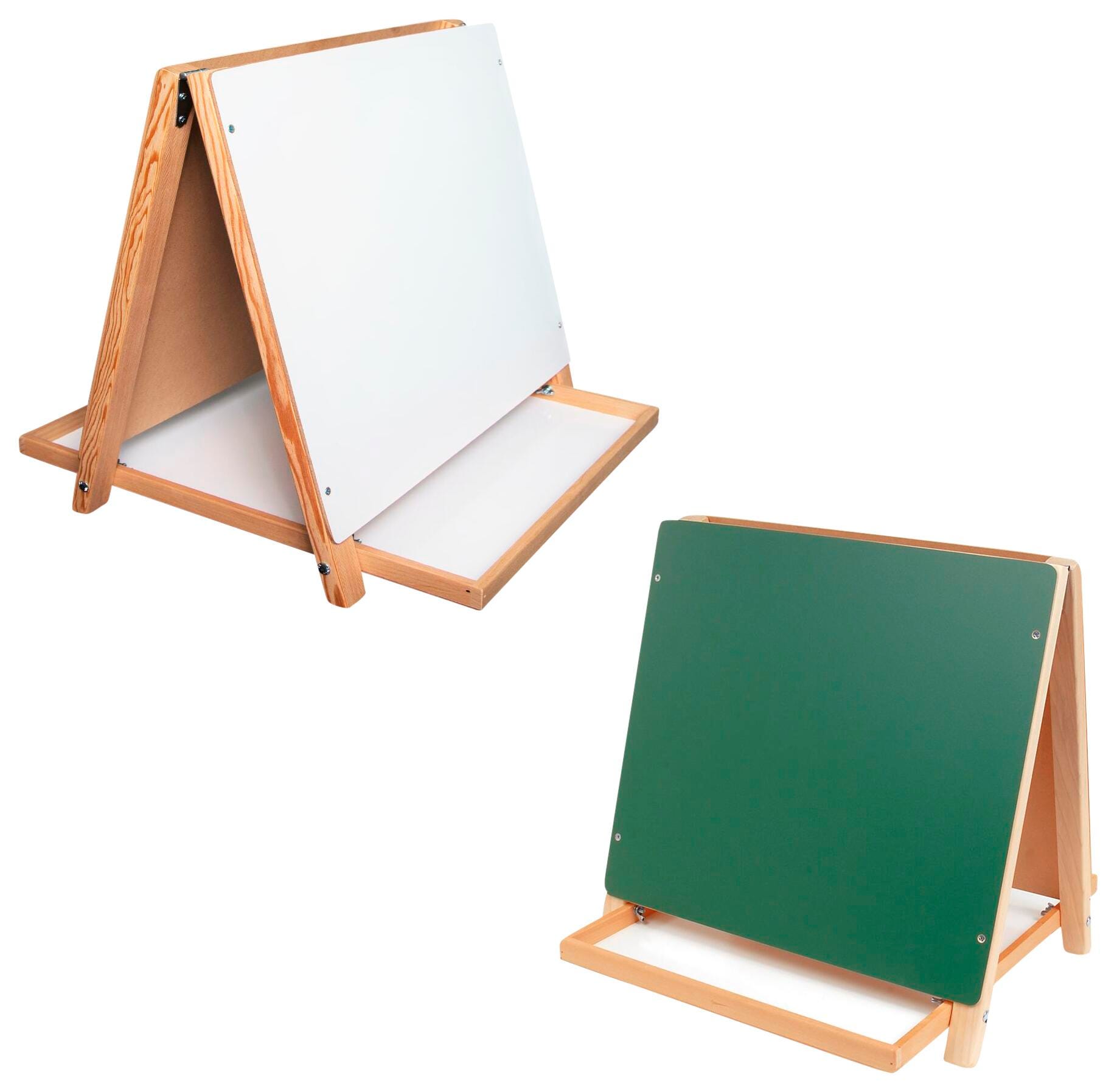 Crestline 3-Way Table Top Easel works three ways: there's a chalkboard on one side and a super write and wipe surface on the other. It's small enough to set up practically anywhere and even folds to store.
