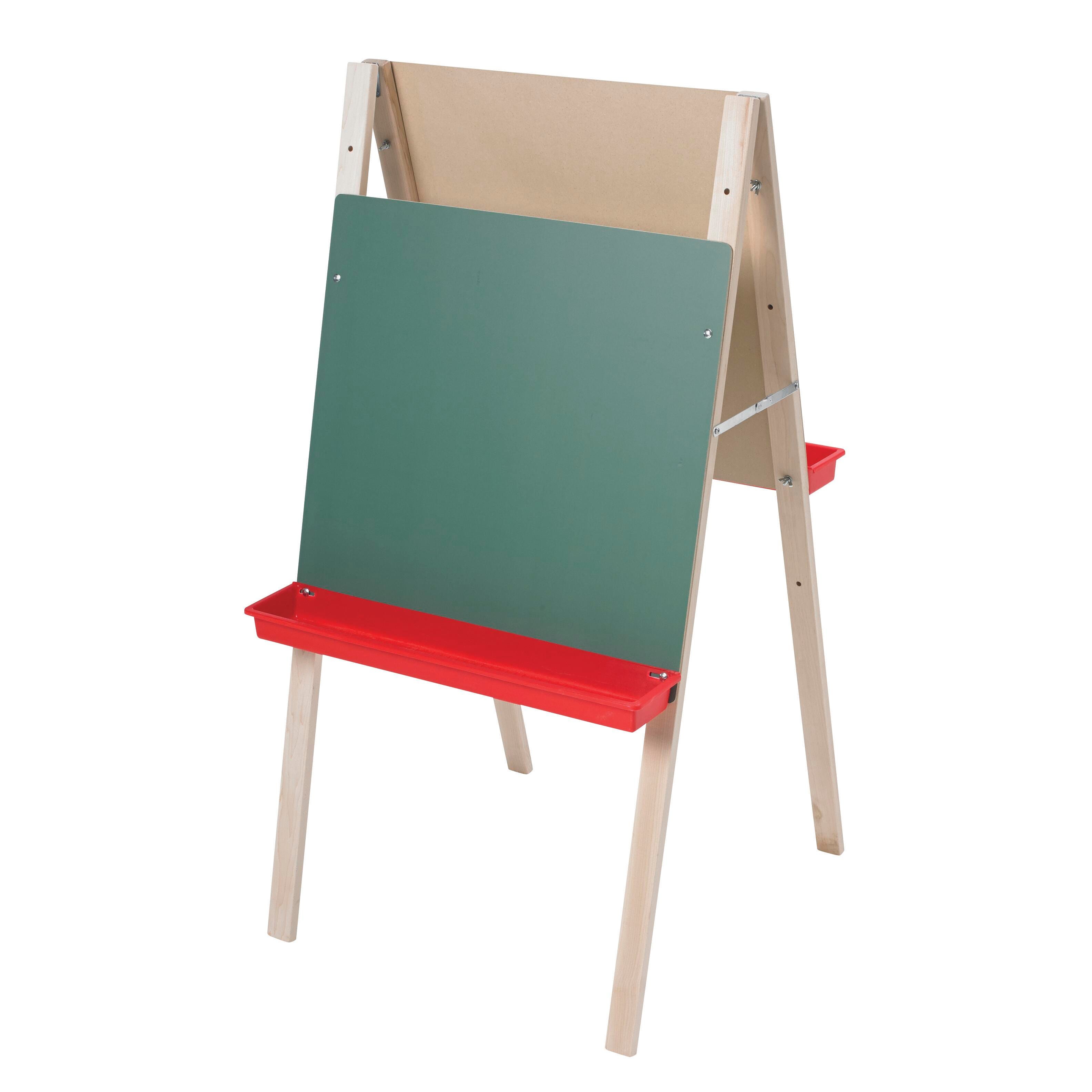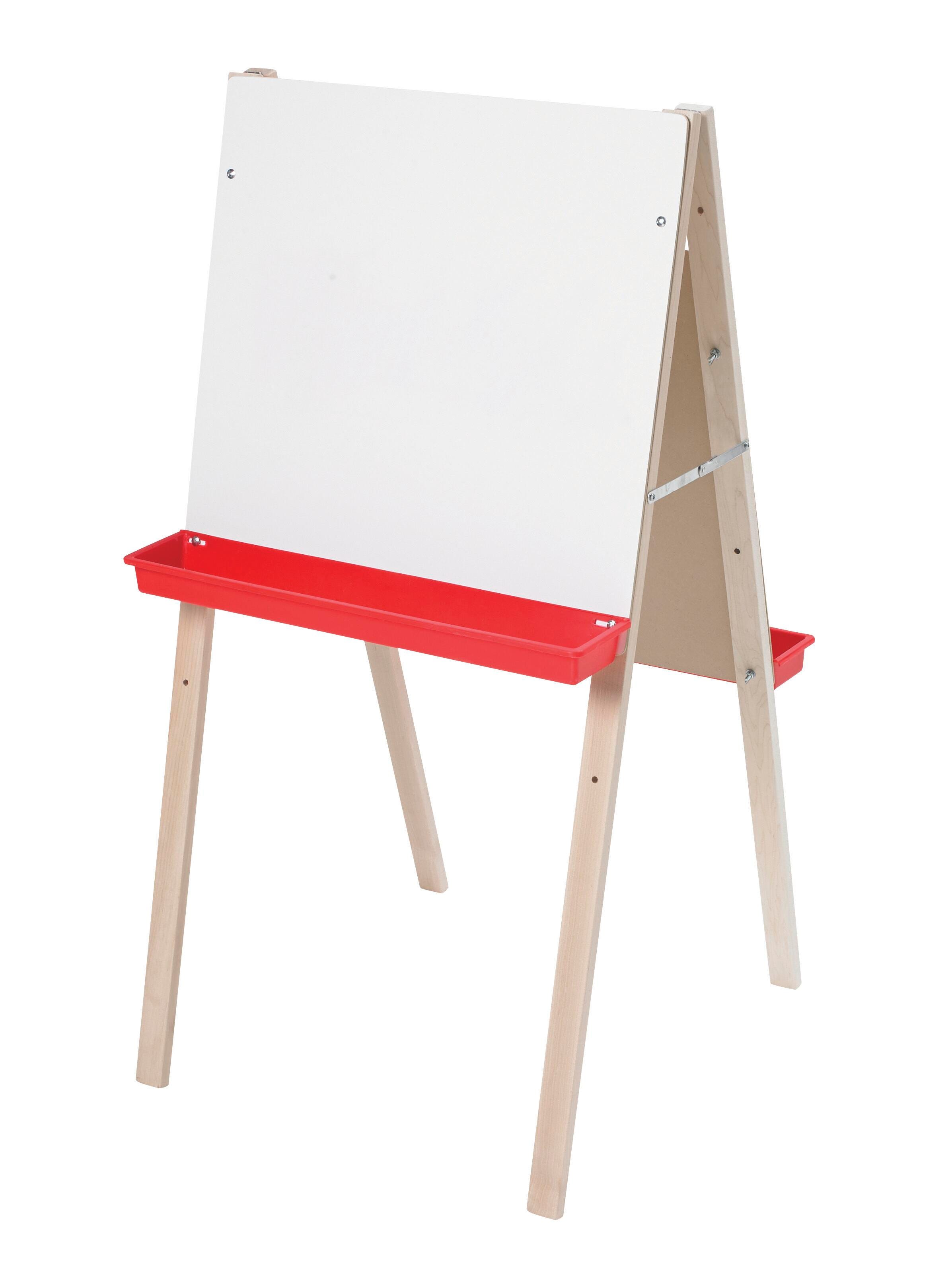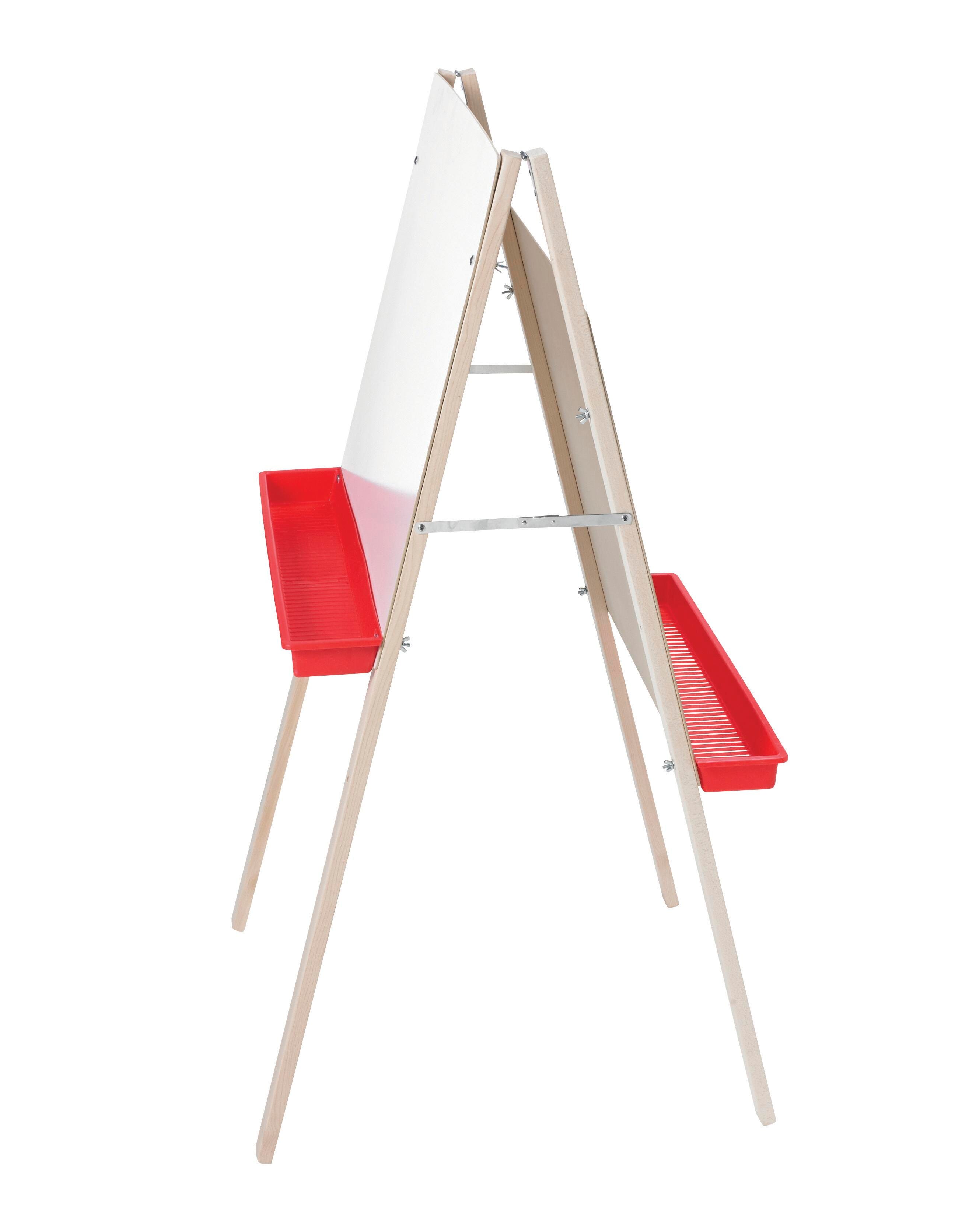 Our adjustable double easel features a white dry erase board on one side and a chalkboard on the reverse. Boards can be adjusted to two heights. Two sturdy plastic trays hold paint pots and markers. Includes two large clips.