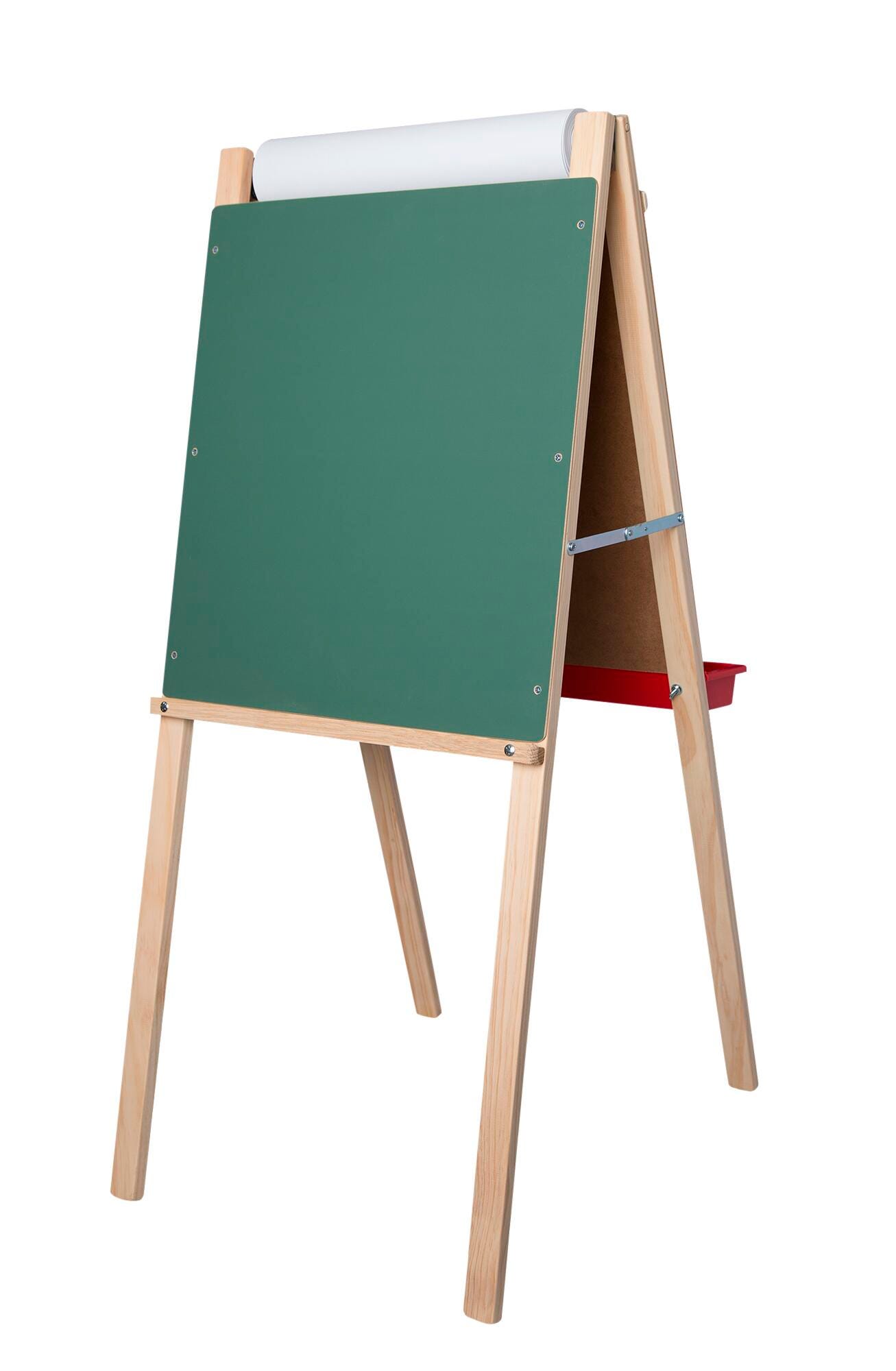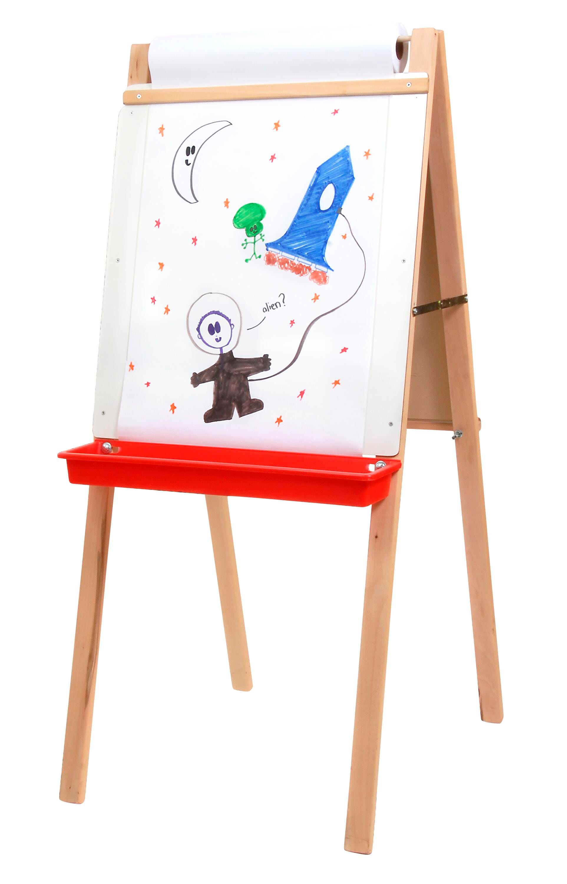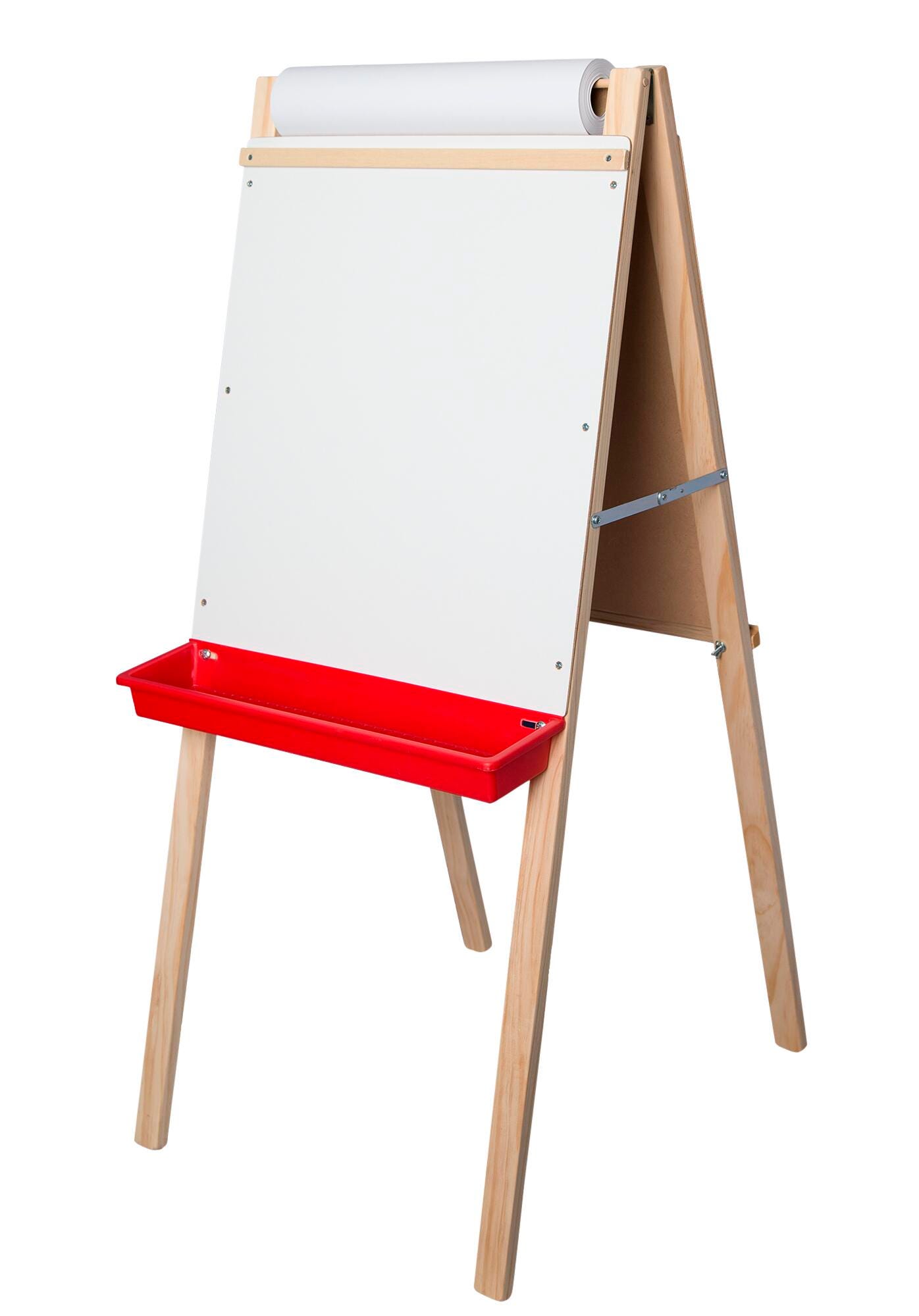Designed for children under the age of 6, this easel features a lead-free chalkboard on one side, a white dry-erase board on the reverse, and a 15 inch x 100 foot paper roll on the top. Side brackets are finger friendly and fold easily for storage. One durable tray is included for storing paint, markers, and supplies. Solid wood construction.