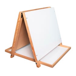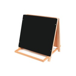 Designed for tabletop use, this easel features a white dry-erase surface on one side and a black chalboard on the reverse. The large center tray provides useful storage space.