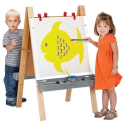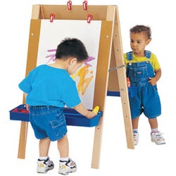 Jonti-Craft Toddler Adjustable Height Art Easel brings art to a toddler's height. Hinged at top, with positive lock braces on side. Adjust the height of the double painting surfaces from 8 to 16 inches high. Comes standard with hardboard easels. Optional Acrylic, Chalkboard and Write-n-Wipe panels available. Clips and paint trays are included. Measures 24 W x 24 D x 40 H inches.Features