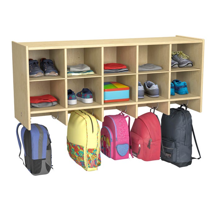 The Childcraft® 10-Cubby Wall Coat Locker offers a smart and space-saving solution for storing coats, bags, lunches, and more. Designed to be mounted at any height, these classroom cubbies are ideal for students of all ages. The cubby locker features 10 individual cubbies and aluminum hooks to keep personal belongings organized and within reach. The compact design is perfect for classrooms, childcare centers, and entryways, helping to maintain clean and clutter-free spaces. Measures 47-3/4 W x 14-1/4 D x 19-3/4 H inches; holds bins or baskets measuring 7-3/4 W x 12 D x 5-1/4 H inches (sold separately). Comes fully assembled.Features