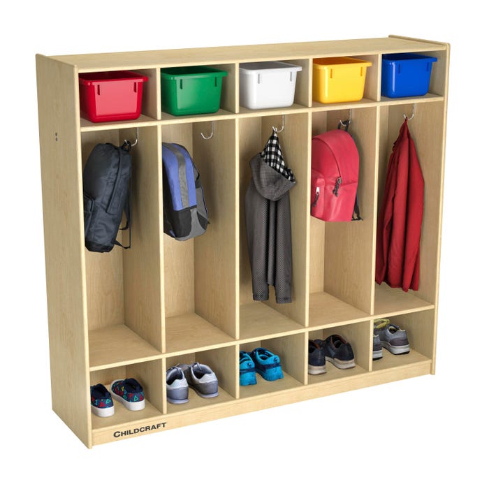 The Childcraft® Coat Locker with 5 Sections is a space-saving storage solution designed to keep coats, backpacks, and personal items organized and accessible. Each locker section includes two solid aluminum hooks (one on each side) for hanging coats or bags, while upper and lower cubbies provide additional room for shoes, lunchboxes, books, or other supplies. With a narrow footprint and open design, this cubby locker is perfect for early learning environments. Crafted from durable birch plywood with a smooth, easy-to-clean finish, this children’s locker is built to withstand everyday use. Measures 53-3/4 W x 14-1/4 D x 48 H inches. Arrives fully assembled. Must be wall-mounted for maximum stability; not recommended as a room divider.Features