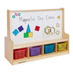 Encourage classroom collaboration with this versatile dual-sided activity center featuring a standard building brick grid, whiteboard, and translucent tray storage.