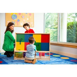 Childcraft® Dual-Sided Building-Brick Activity Center offers a perfect blend of entertainment and organization for children. One side features a multi-colored brick grid for standard-sized building blocks, while the other side provides a magnetic dry erase board for drawing, writing, and problem-solving. The play unit includes four removable translucent-colored trays for convenient storage of bricks, markers, or other supplies. This activity center promotes teamwork and creative exploration, making it ideal for classrooms, daycares, or playrooms. Comes fully assembled. The compact activity wall measures 39-1/2 W x 14-1/4 D x 30 H inches.Features