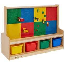 Childcraft® Dual-Sided Building-Brick Activity Center offers a perfect blend of entertainment and organization for children. One side features a multi-colored brick grid for standard-sized building blocks, while the other side provides a magnetic dry erase board for drawing, writing, and problem-solving. The play unit includes four removable colored trays for convenient storage of bricks, markers, or other supplies. This activity center promotes teamwork and creative exploration, making it ideal for classrooms, daycares, or playrooms. Comes fully assembled. The compact activity wall measures 39-1/2 W x 14-1/4 D x 30 H inches.Features