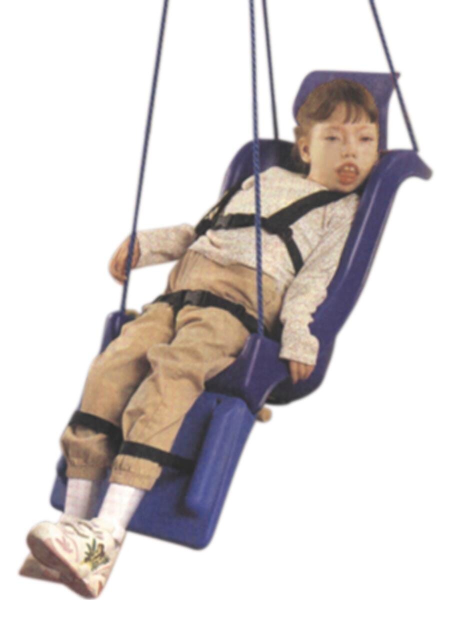 Special Swing is made of high-density polyethylene, a strong but comfortable plastic. Seat comes with a pommel (abductor to keep legs separated), a safety harness with snap buckles and adjustable ropes. Rope lengths adjustable to fit frames up to 10' high (may be used on any swing set). This child-size swing measures, 11 W x 8 D x 24 H inches and has a maximum weight capacity of 75 lbs. Full Swing Set includes headrest, swing, ropes and leg support.Features