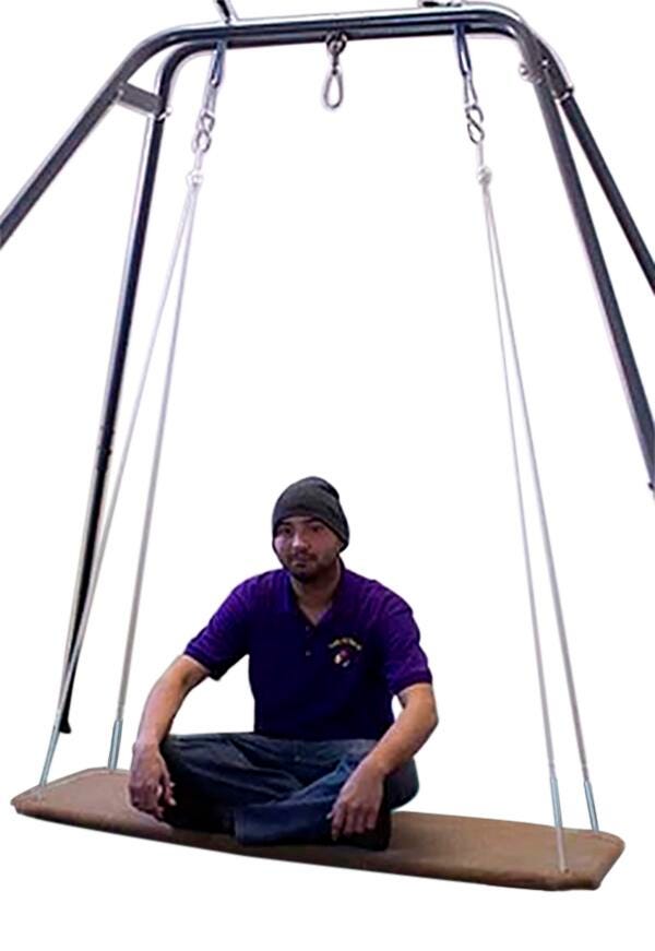 Carpeted Plywood Platform Swing is made with light-but-strong Baltic birch plywood. Has no sharp corners and allows the user to easily sit, kneel, stand or crouch. The swing can be used with a swivel hook or with the 2 stationary hooks for a place to sit, stand, read or receive therapy. Hooks not included. Swing also works as a glider when placed sideways. Measures 20 x 59 x 3/4 inches. Weight capacity: 450 pounds. Swing only, Frame not included.