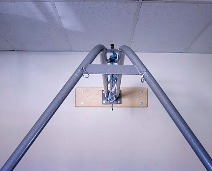 The popular Swing-Swing frame is unlike anything else. Great for multi-purpose rooms where you can't have a swing permanently set up. Schools and therapists love the Swing-Swing. For those who don't want a large A-frame in the middle of their room, the Swing-Swing is a perfect solution. With the swing arm lowered and the legs down against the wall, the Swing-Swing virtually disappears. Use in rooms as narrow as 10 x 16 feet. Attaches to any wall at least 8 feet high. Includes attaching clips, swivel and our popular and innovative smooth swinging rope hangers. Installation required. The wall plate is 8 x 30 inches and needs to be securely fastened to a stable wall. Once installed, you have a swing frame that can be easily set up or taken down in less than a minute. Weight capacity: 400 pounds. Swing not included.