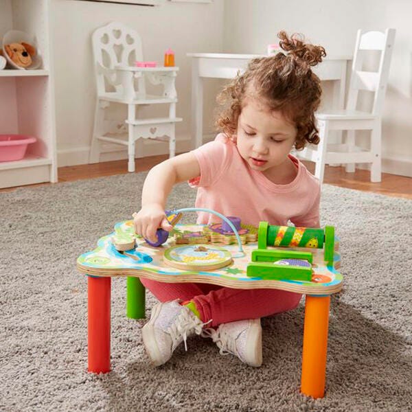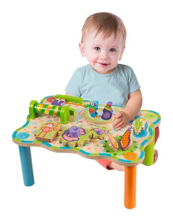 Description Features include gears to turn, a tube to roll, beads to slide, flaps to open, a wheel to spin, and easy-to-grasp pieces to flip, push, and pull! Sturdy wooden construction, paired with whimsical jungle-themed designs, make this a long-lasting and welcome addition to any playroom. Features bright colors, bold patterns, and whimsical designs that boost skills while sparking imagination and wonder right from the start! Adult assembly is required.Features Features 8 different hands-on activities to encourage important developmental skills Attached pieces turn, roll, flip, spin, slide, and more Sturdy wooden construction, bright colors, bold patterns, and whimsical design Includes: Wooden Jungle Themed Activity Table
