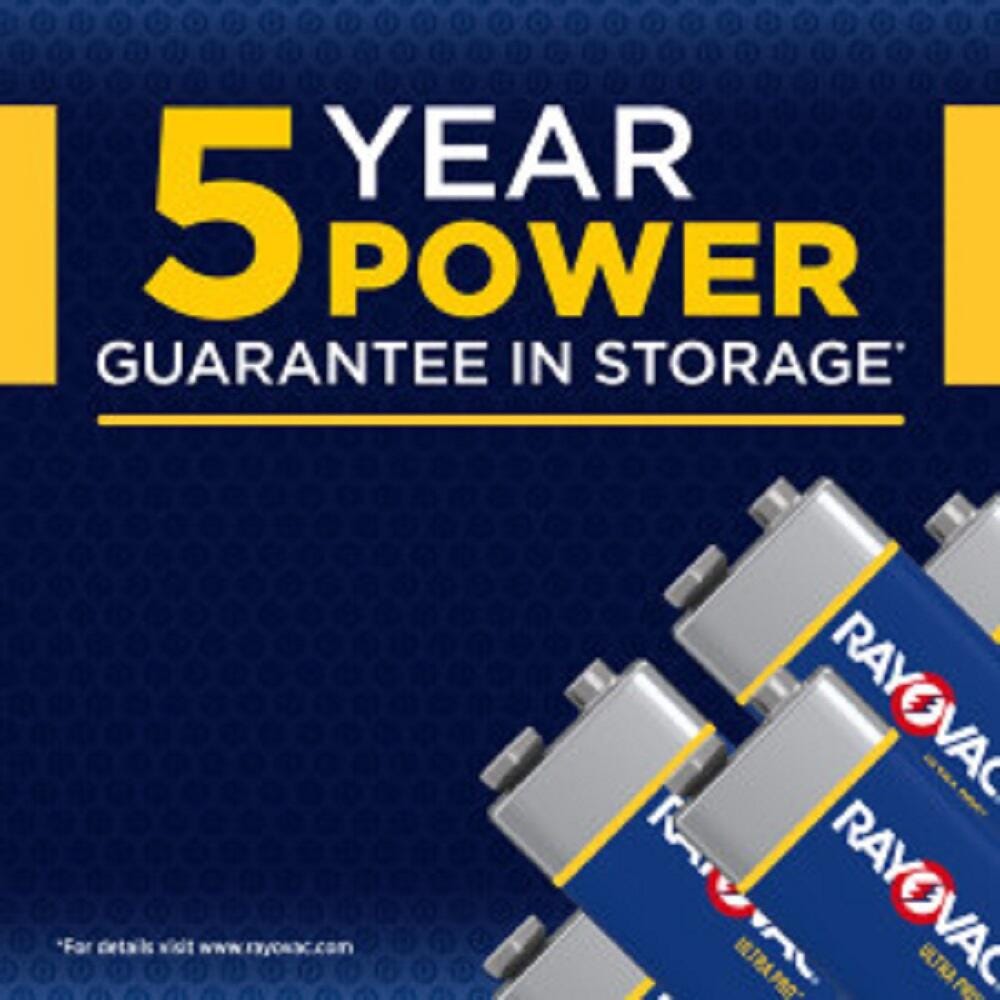 The Rayovac Ultra Pro 9V Batteries are made with a 5-year guarantee to offer long-lasting power for the devices you need most. The mercury-free formula is specially engineered for professional use on jobsites and other industrial settings. The re-closeable container helps organize and protect batteries from damage and short-circuiting in the toughest environments. This pack contains twelve 9V batteries.Features