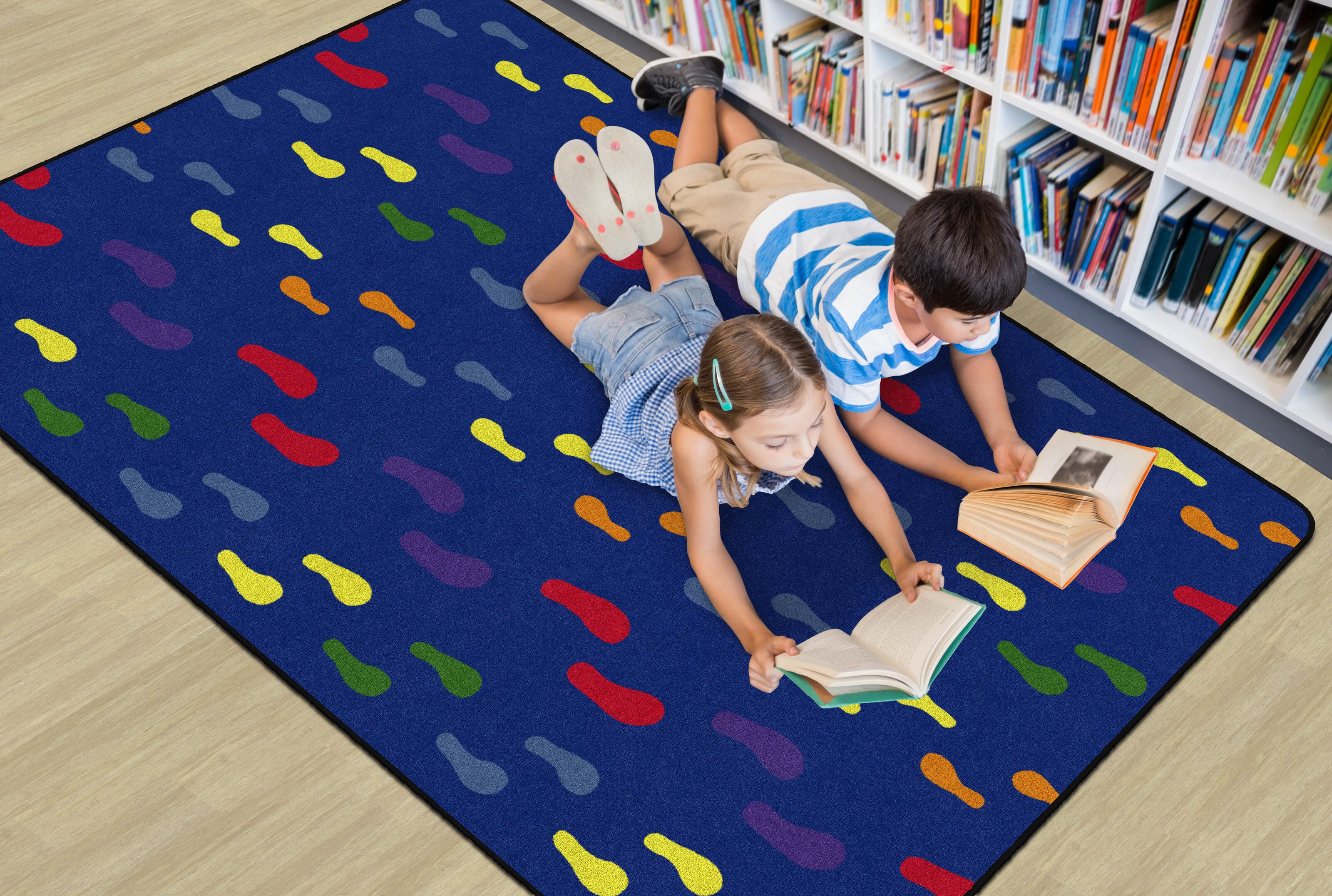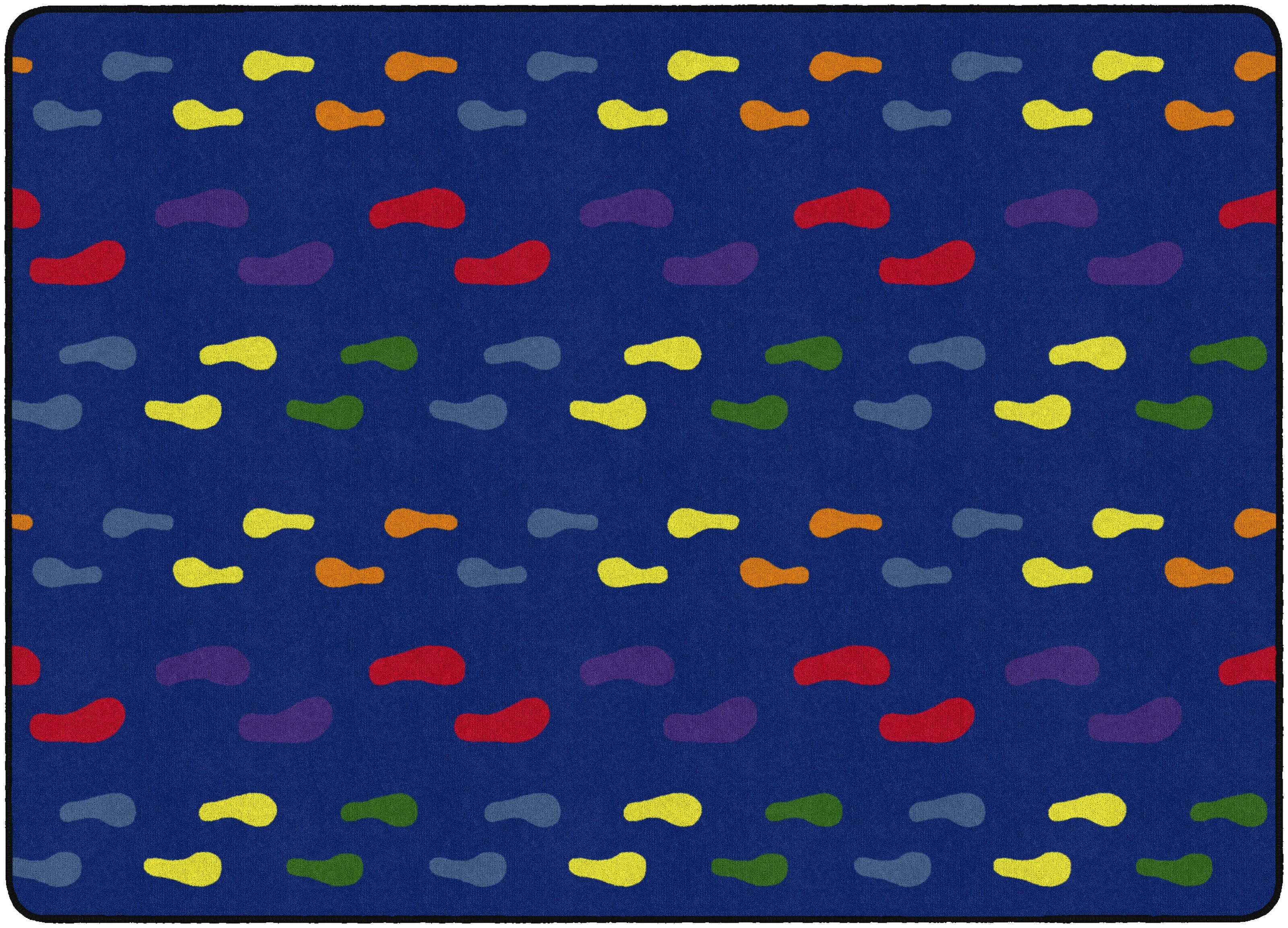 This Flagship Carpets floor covering is designed with different sized footprints in bright primary colors. Built durable for high-traffic areas where foot traffic is common, it encourages students to skip, gallop, or stomp along with the multicolored footprints along its surface. Perfect for spaces where little learners frequent - playrooms, preschools, classrooms, and childcare centers. Washable carpets feature skid-resistant backing to prevent slips and trips and are treated with SCOTCHGARD-PROTECTOR for superior soil resistance and FORCE 5, a permanent anti-microbial agent to guard against odor, mildew, and mold. All Flagship Carpets are CRI Green Label Plus Certified. Backing contains synthetic (SBR) latex for those with latex allergies. Rectangle carpet is available in several sizes to match your space.
