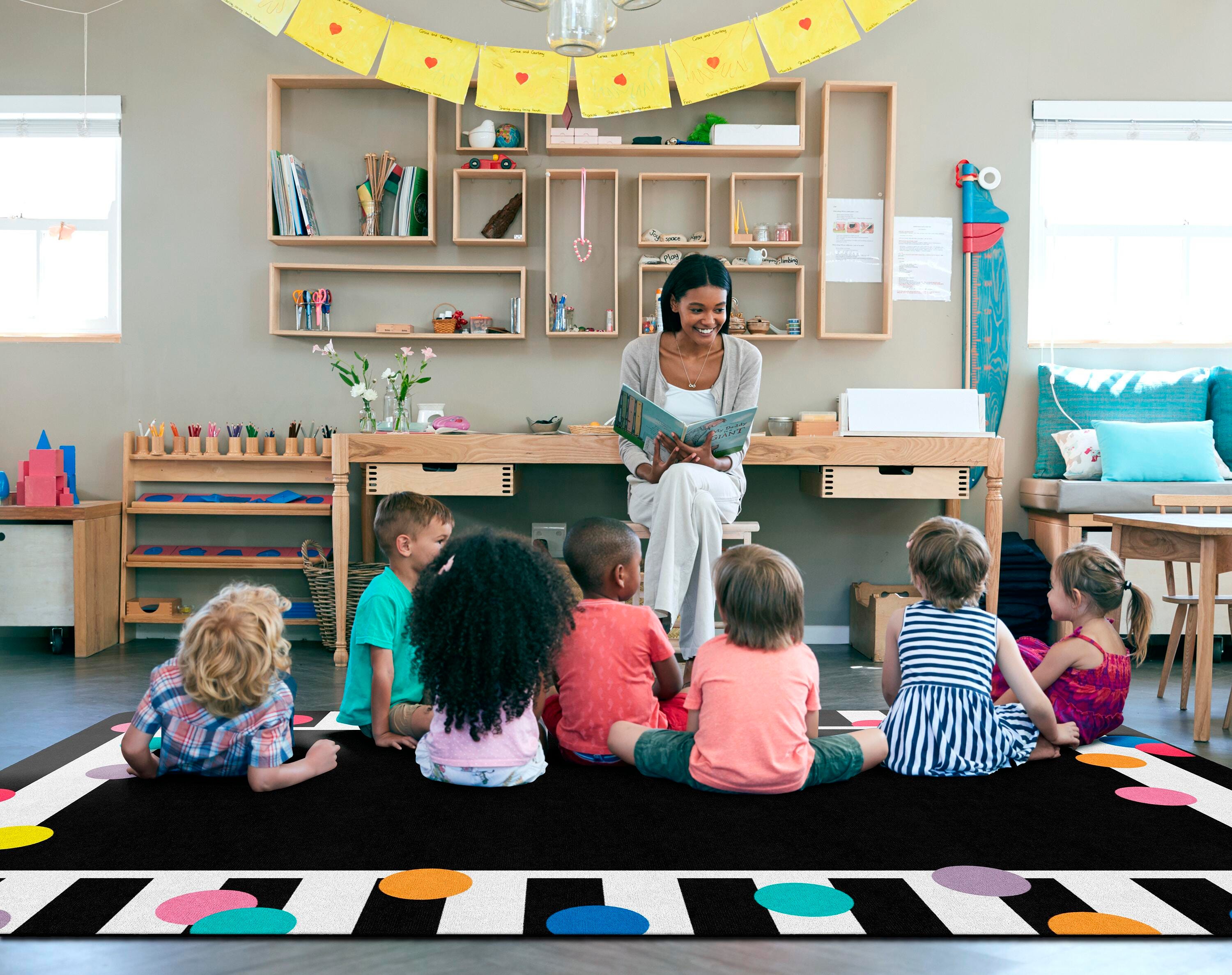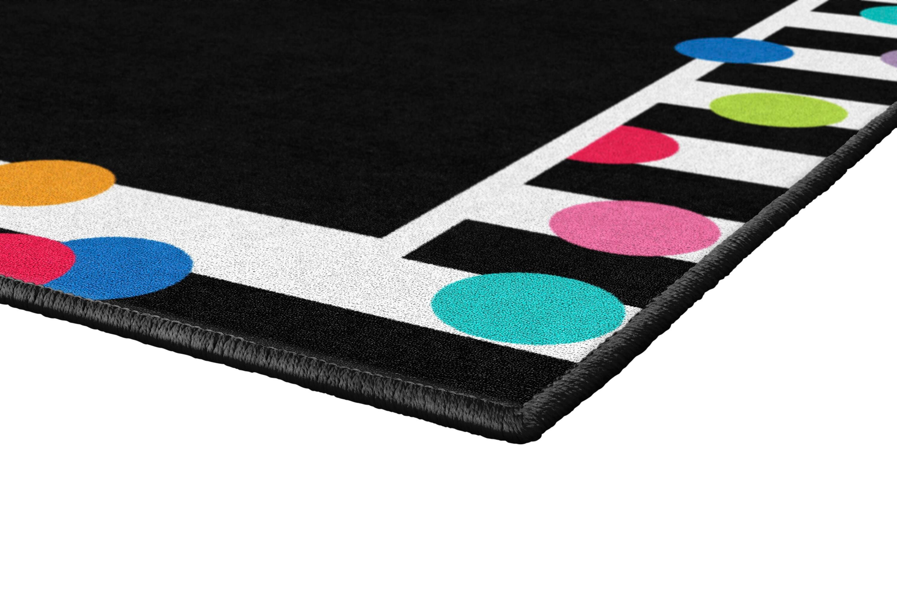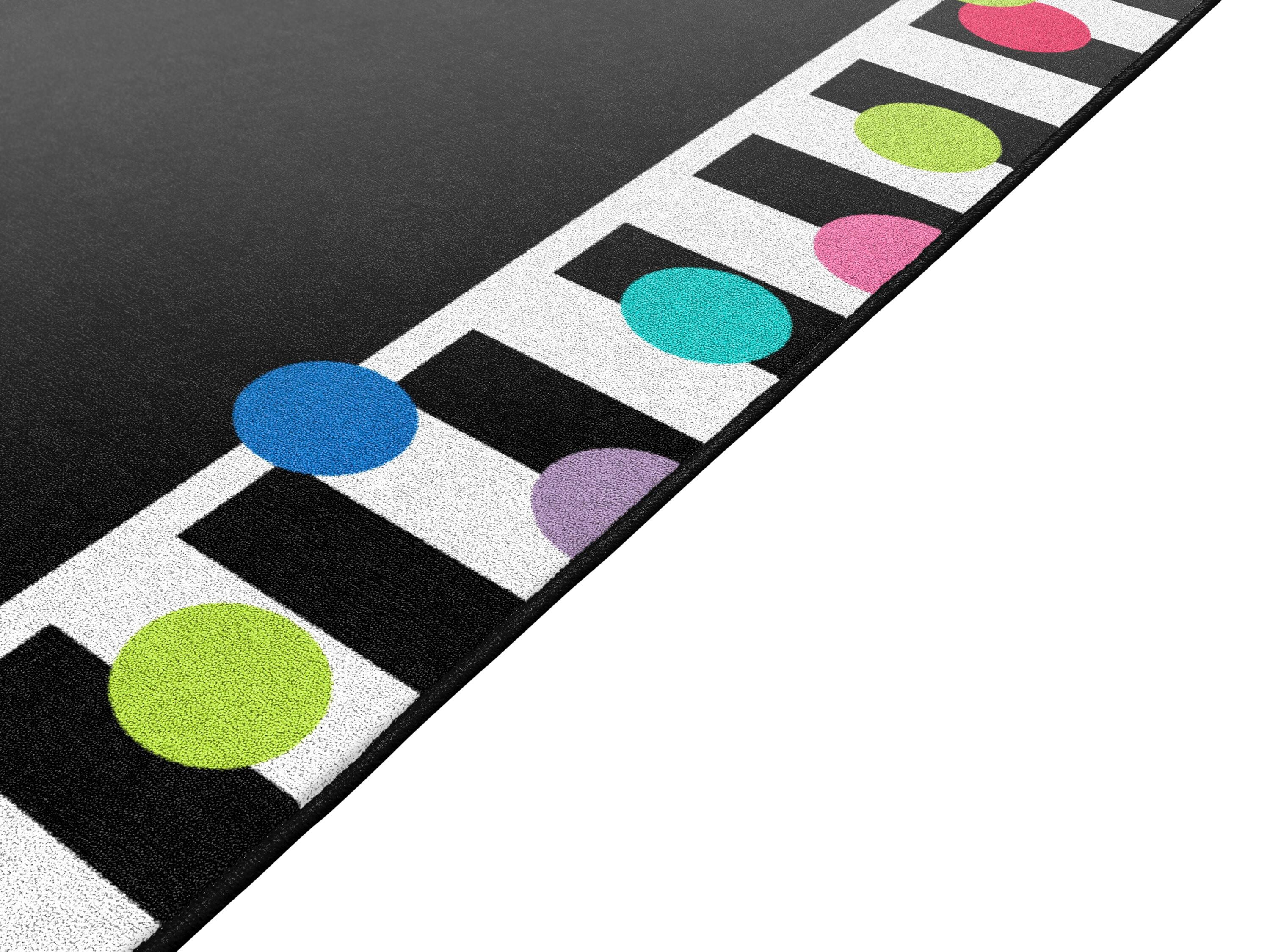 Bring a touch of sophistication to your space with this timeless and elegant black-and-white striped design with fun colorful polka dots lining its border. This area rug acts as a classy contrast to the typical bright and colorful educational designs without clashing. Polka dots adorn the border for a touch of fun paired with black-and-white stripes while creating a solid black seating space inside its border. This seating carpet is comfortable for students to use for storytime or circle time and is perfect for spaces where children gather - in their preschool, classroom, playroom, or childcare center. This floor covering is made with 100% nylon for a recyclable yet durable design for an environmentally friendly design solution. This rectangle carpet is available in several sizes to fit your space.Features