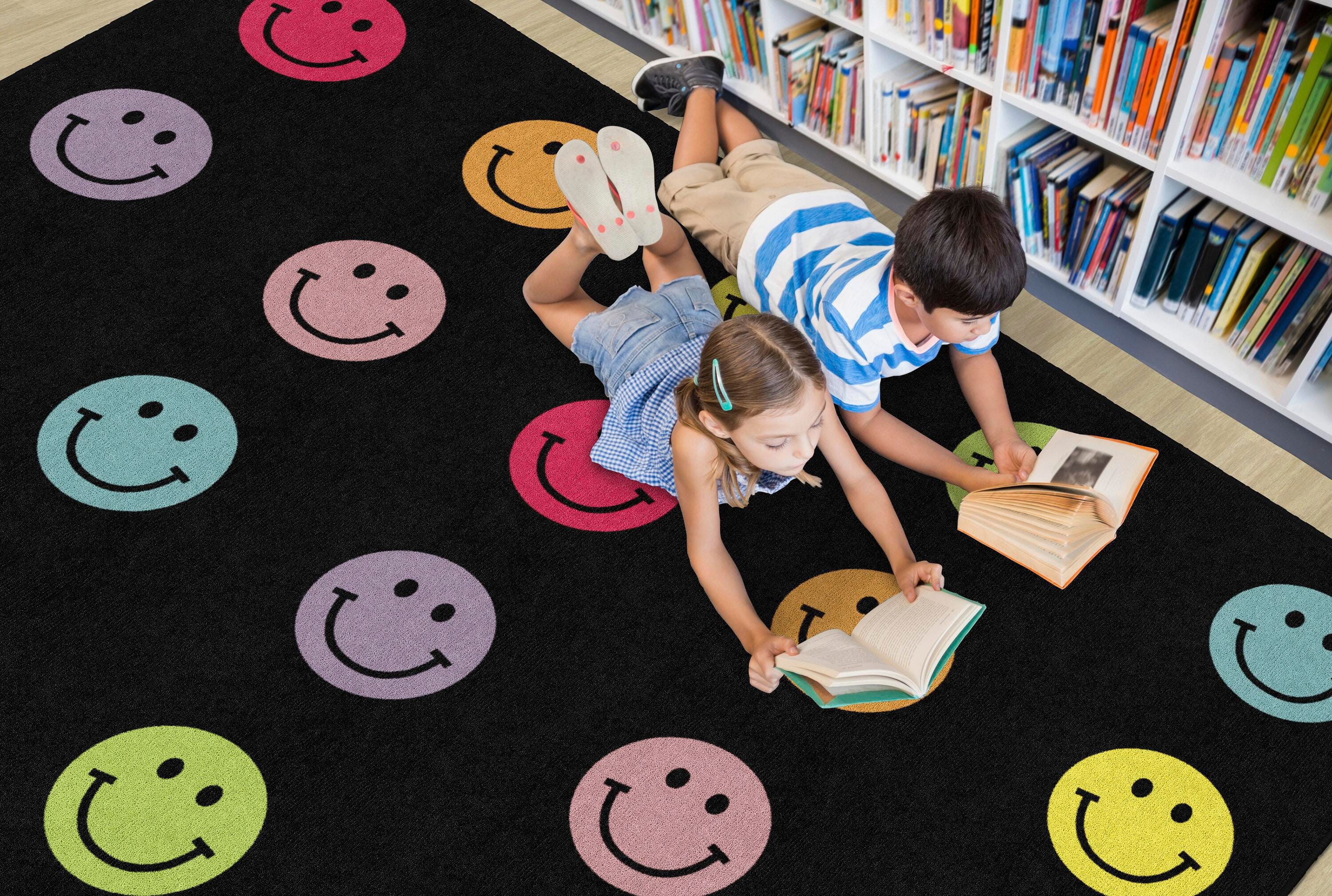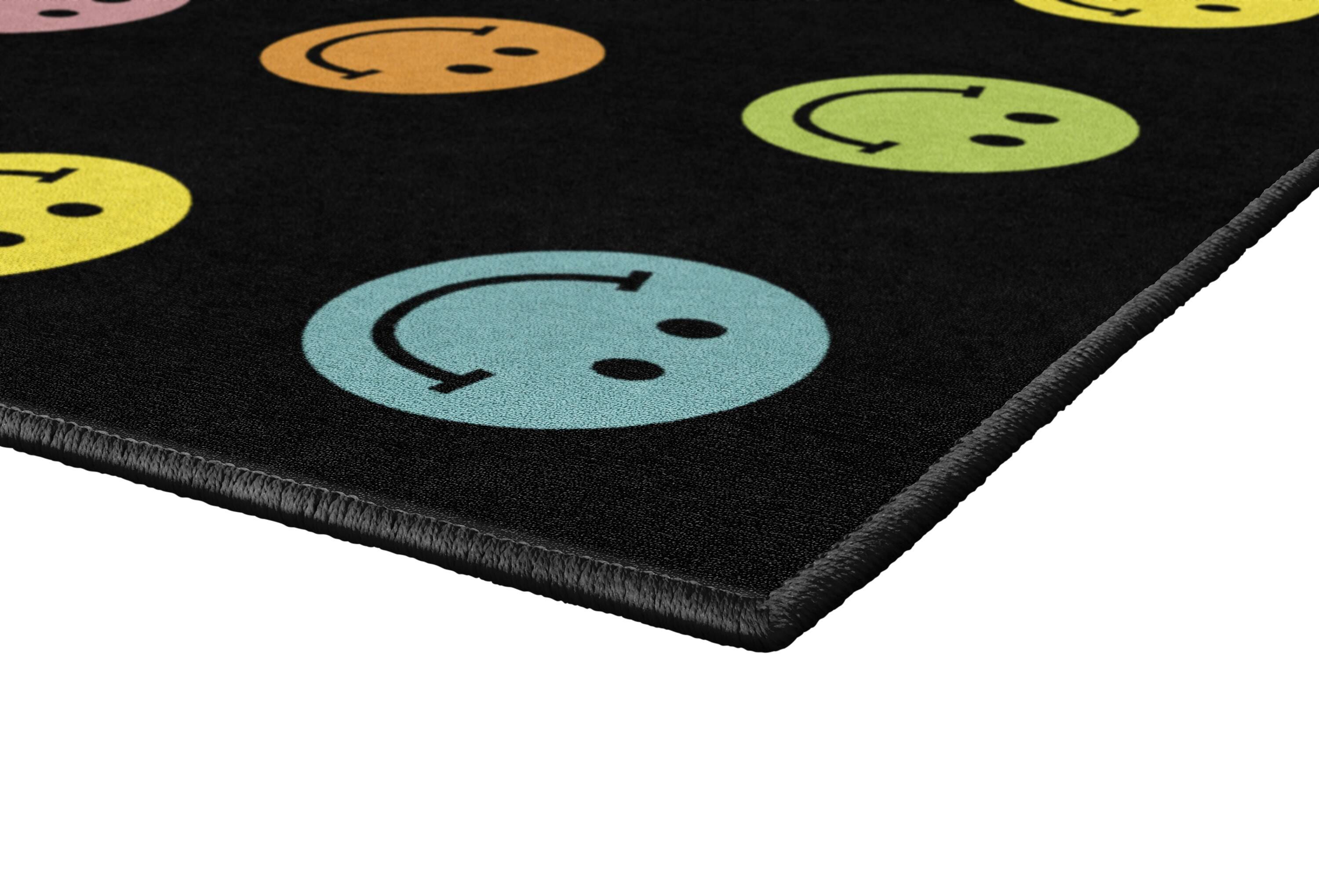 The criss-cross applesauce smiley faces on this classroom rug are sure to bring instant cheer! And the classic rainbow palette with the black background makes this bright and beautiful rug a showstopper, whether it's an aesthetic area rug or a functional seating carpet for your educational space. This rug coordinates beautifully with many of the Schoolgirl Style classroom decor themes. This rectangle carpet is available in a variety of sizes to best match your space. Please select the correct size when ordering.