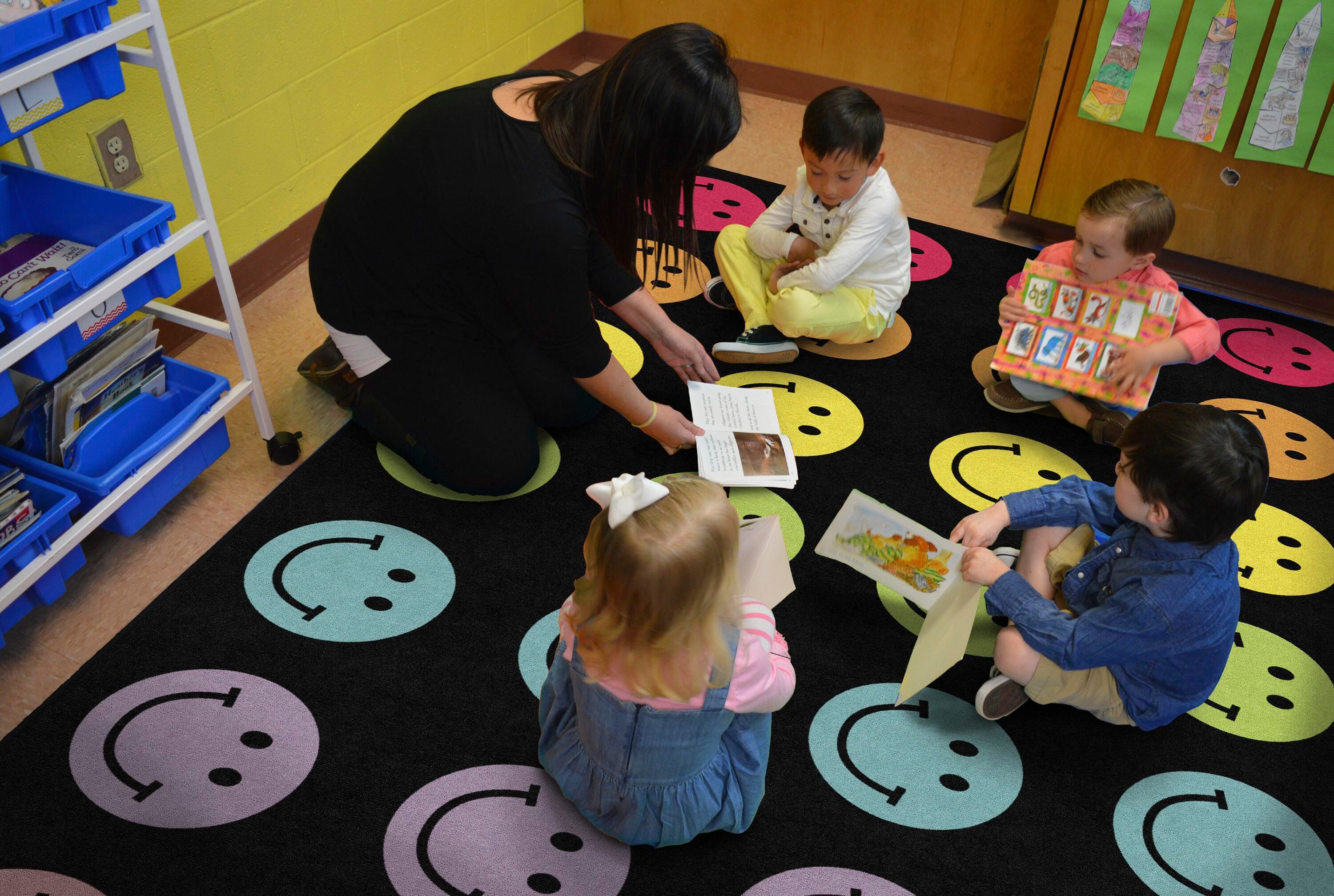 Criss-cross applesauce on this colorful criss-cross designed classroom carpet. This carpet is available in a variety of sizes to best match your space.